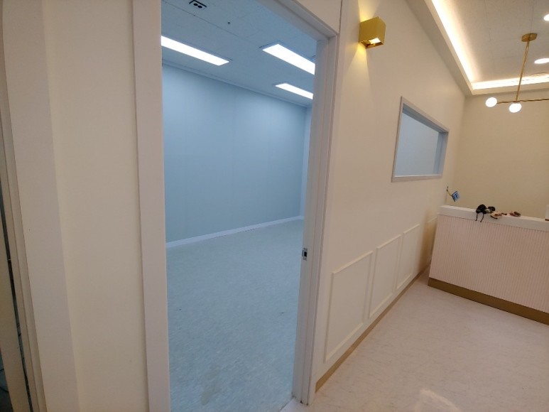 복도 벽면과 천장은 크림색의 웜톤화이트로 마감하고 따뜻한 조명을 적용했으며 바닥은 유광재로 마감해 조명이 바닥에 비춰 공간을 더욱 넓고 높고 아늑해 보이도록 했습니다. 천장 테두리를 따락 간접조명을 시공해 은은하면서 따뜻한 분위기를 연출했고 매립현 조명을 시공해 충분한 조도를 확보했습니다. 또한, 벽면에는 세련된 벽부조명을 적용해 멋스러움을 더했고 인포메이션 공간의 천장에는 펜던트형 디자인 조명을 적용해 포인트를 주었습니다.