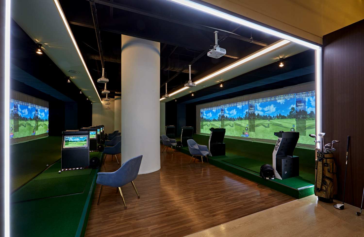 누구나 편하게 즐길 수 있는 스크린 골프장이 마련되어있으며, 이곳은 전체를 라인 조명으로 둘러 보다 화사한 환경을 만들었는데요. 실제로 골프하는 느낌을 내기 위해서 각 기계 옆에는 잔디를 시공하였으며 간격을 넓게하여 이용하시는데에 불편함이 없도록 도와드렸습니다.