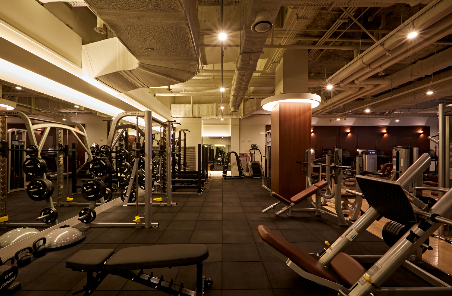 여느 신촌 아현 공덕 헬스장인테리어와 마찬가지로 천장은 노출 시공하여서 공간을 더욱 넓어보이게 했는데요. 이 헬스장의 기구들은 실버 프레임과 브라운 가죽으로 되어 있어서 더욱 멋스러운 느낌을 내고있어 인테리어 자체를 아름답게만들어주었어요.