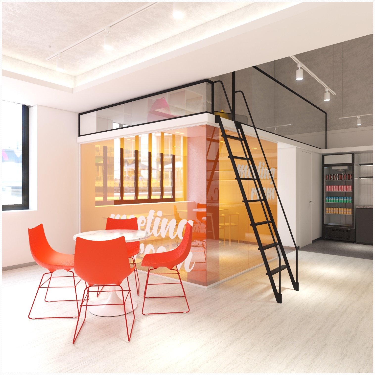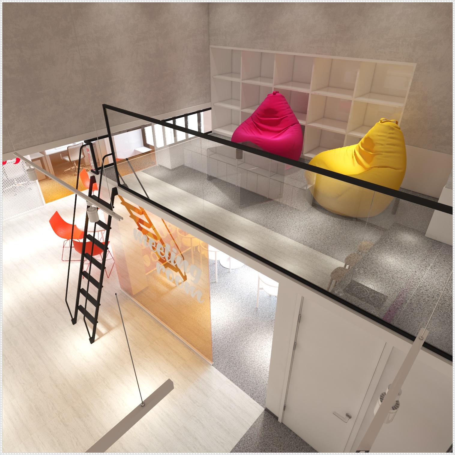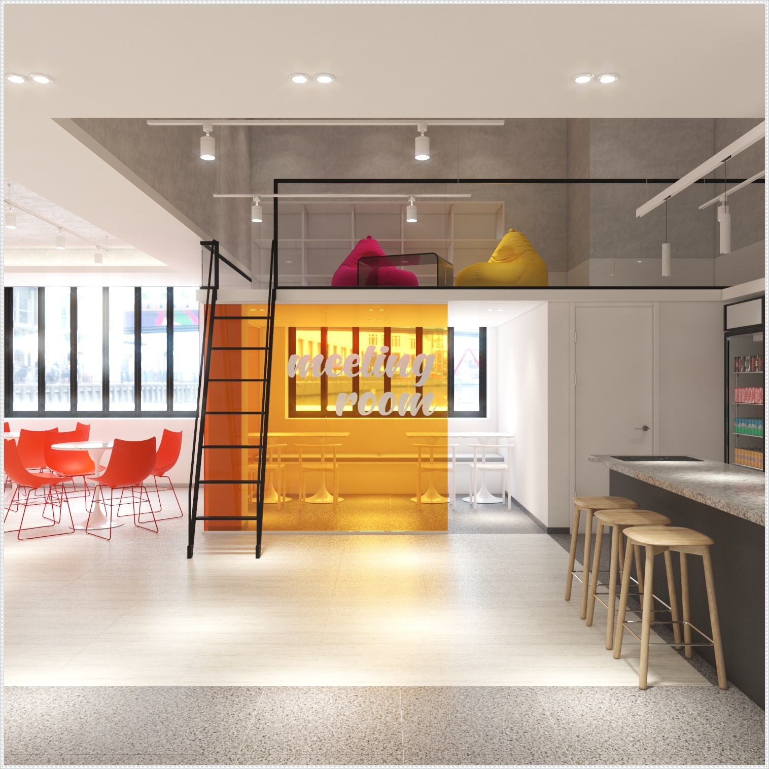 멀리서 바라본 휴게실의 모습입니다. 넓은 휴게 공간을 갖추고 있는 곳으로 거기에 2층 형태의 구조로 설계하여 더욱더 공간 활용에 있어 실용적인 측면을 확인해 보실 수 있습니다. 심플 모던하면서 포인트 컬러가 들어가 산뜻한 분위기를 보여주는 아산 이천 용인 쇼핑몰 사무실인테리어, 카페같은 복층사무실입니다.