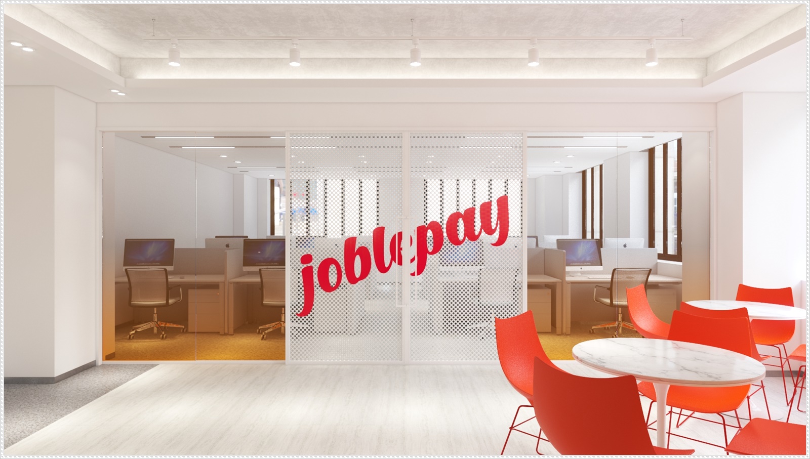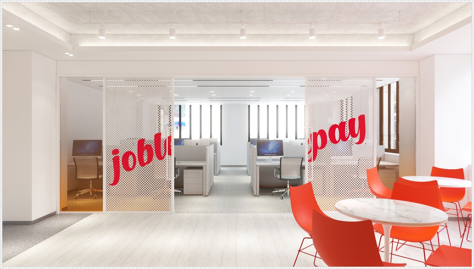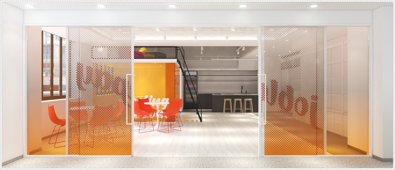 공용 사무 공간으로 들어가는 도어에는 회사 이름이 들어간 감각적인 디자인이 돋보이는 멋진 도어를 설계하였으며 슬라이딩 형태로 디자인하여 공간 활용도를 높여 드렸습니다.