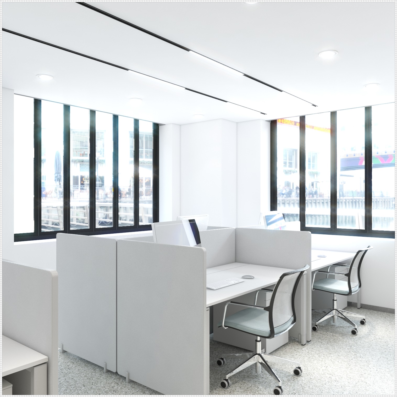 공용 사무공간은 깔끔하고 심플한 분위기로 연출하기 위해 책상과 의자 모두 화이트 컬러로 디자인하였습니다. 거기에 천장에는 매입 간접조명으로만 설계하여 더욱더 깔끔해 보이는 공간으로 디자인하였으며 그로 인해 군더더기 없이 깨끗한 분위기를 보여주는 공용 사무공간으로 완성되었습니다.