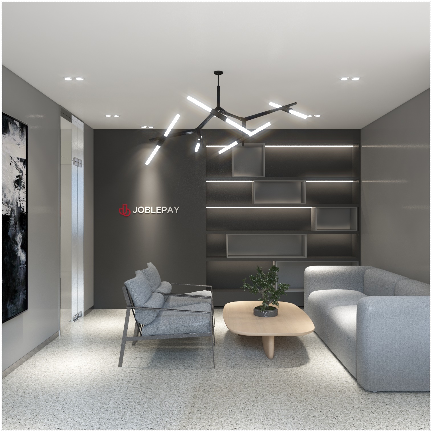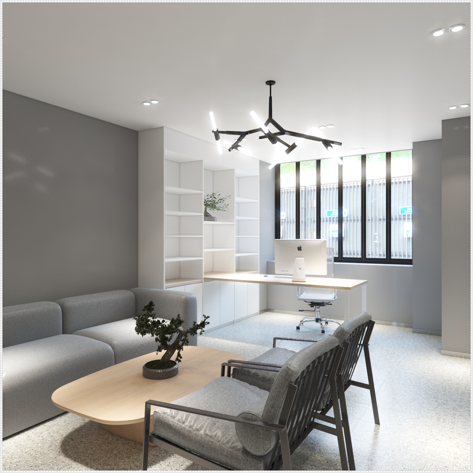 고급스러운 분위기를 보여주는 개별 사무 공간입니다. 그레이 컬러와 화이트를 기본 베이스로 하여 모던한 디자인에 멋진 디자인이 돋보이는 조명이 포인트가 되어 사무실 공간을 매력적이게 만들어 주고 있습니다.