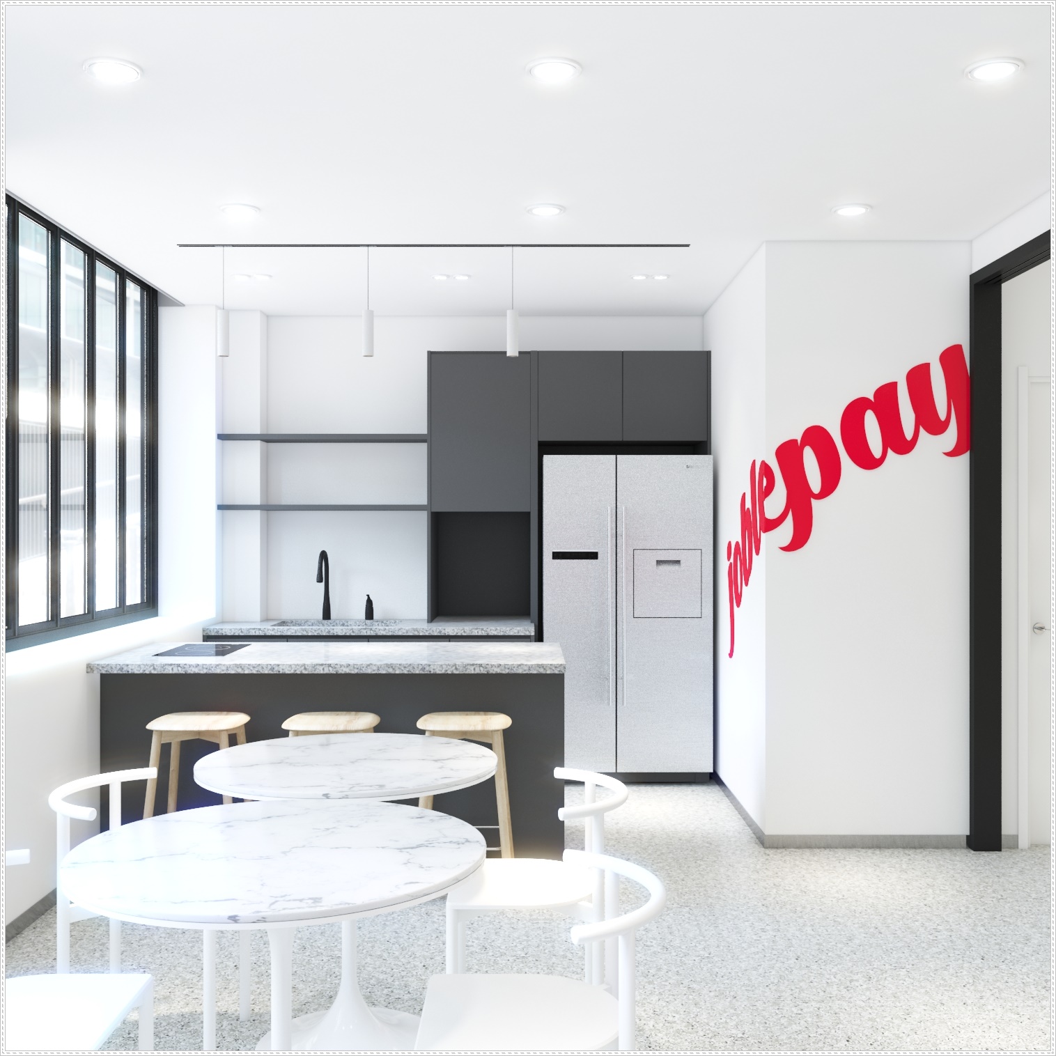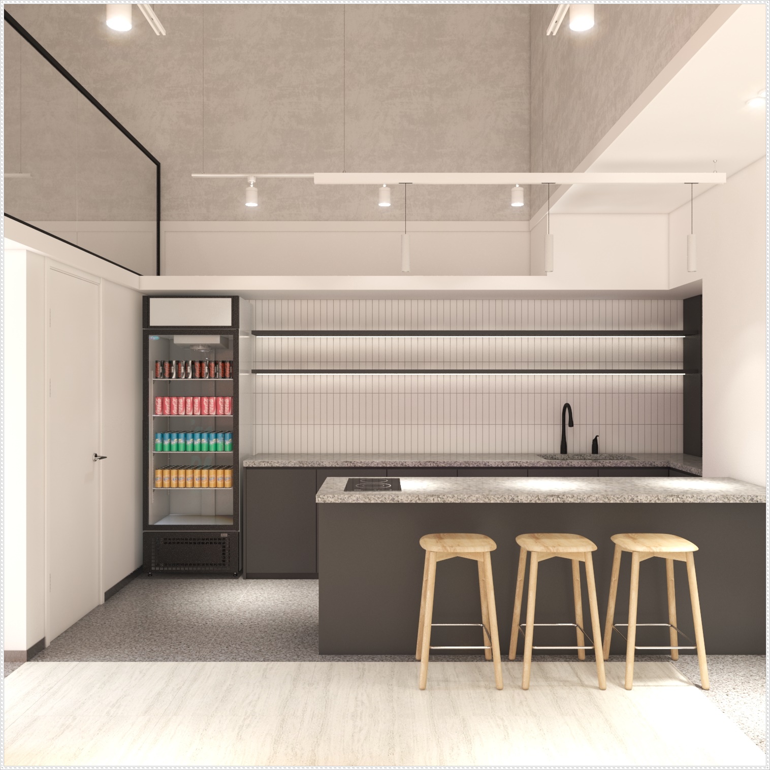 간단하게 조리를 할 수 있는 공간으로 심플 모던한 분위기로 디자인하였습니다. ㄷ자 구조의 편리한 조리 공간으로 설계하였으며 상부장부분에는 오픈형 수납장으로 디자인하여 공간이 넓어 보이도록 하였습니다. 거기에 천장에는 레일등을 설계하여 멋진 공간으로 디자인 연출하였습니다.