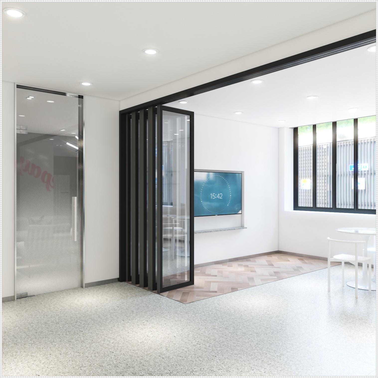 이번 현장의 경우 휴게실과 공용 사무실 사이에 슬라이딩 도어를 설치하여 공간 분리를 확실하게 해드렸습니다. 거기에 답답한 느낌이 들지 않도록 개방된 모습의 유리 벽면과 디자인이 들어간 도어를 설계하여 공간이 넓어 보이도록 연출하였습니다.