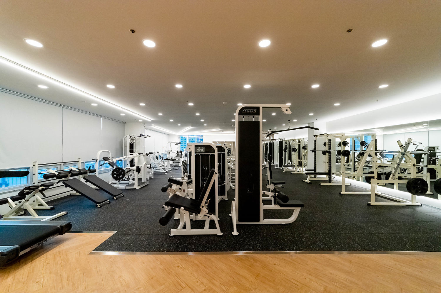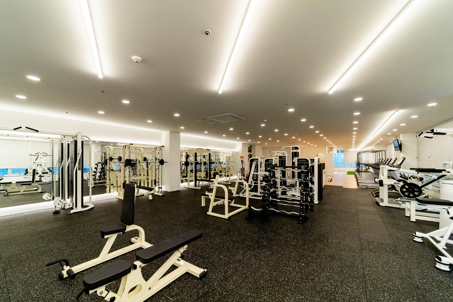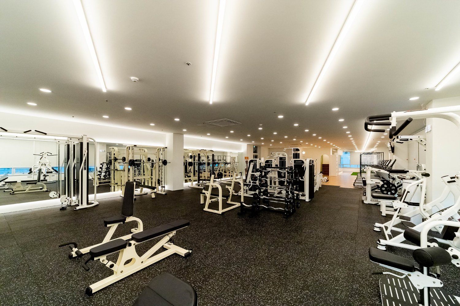 또한 중앙쯤에는 라인 조명을 마치 햇살처럼 대각선으로 배치하여 이색적인 포인트를 주었는데요. 그 밖에도 거울이나 곳곳에 조명이 매립되어있어 어디에서 운동을 하더라도 전혀 시야에 불편함이 없도록 하였습니다. 그리고 공간 자체가 길게 세로로 되어있기에 넓다는 느낌을 받기에 충분해보였습니다.