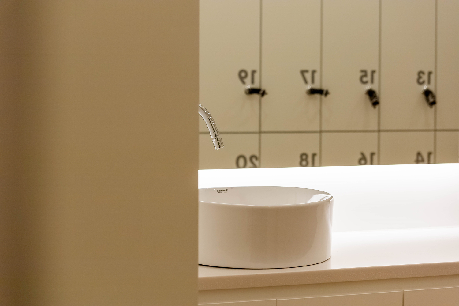 이 곳은 탈의실입니다. 하얀색 캐비넷이 깔끔하게 배치되어 있으며 간단한 세면대와 거울이 설치되었습니다.