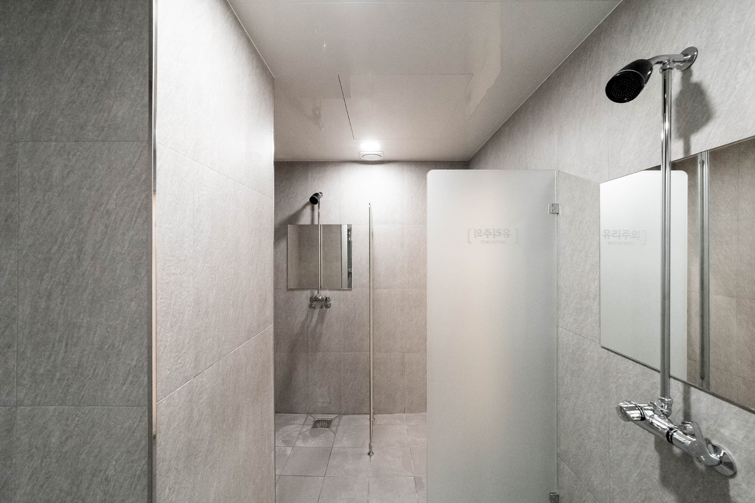 화장실 내부는 그레이 톤의 타일로 깔끔한 이미지와 호텔 욕실과 같은 분위기를 내었는데요. 아예 공간분리를 하지는 않았지만 불투명 유리로 칸막이를 해두어 최소한의 프라이빗함을 지킬 수 있게 하였으며 미끄럽지 않도록배수에 특별히 신경을 썼습니다. 그리고 어두운색 타일은 청소 및 관리하기가 용이한것도 명백한 사실입니다.