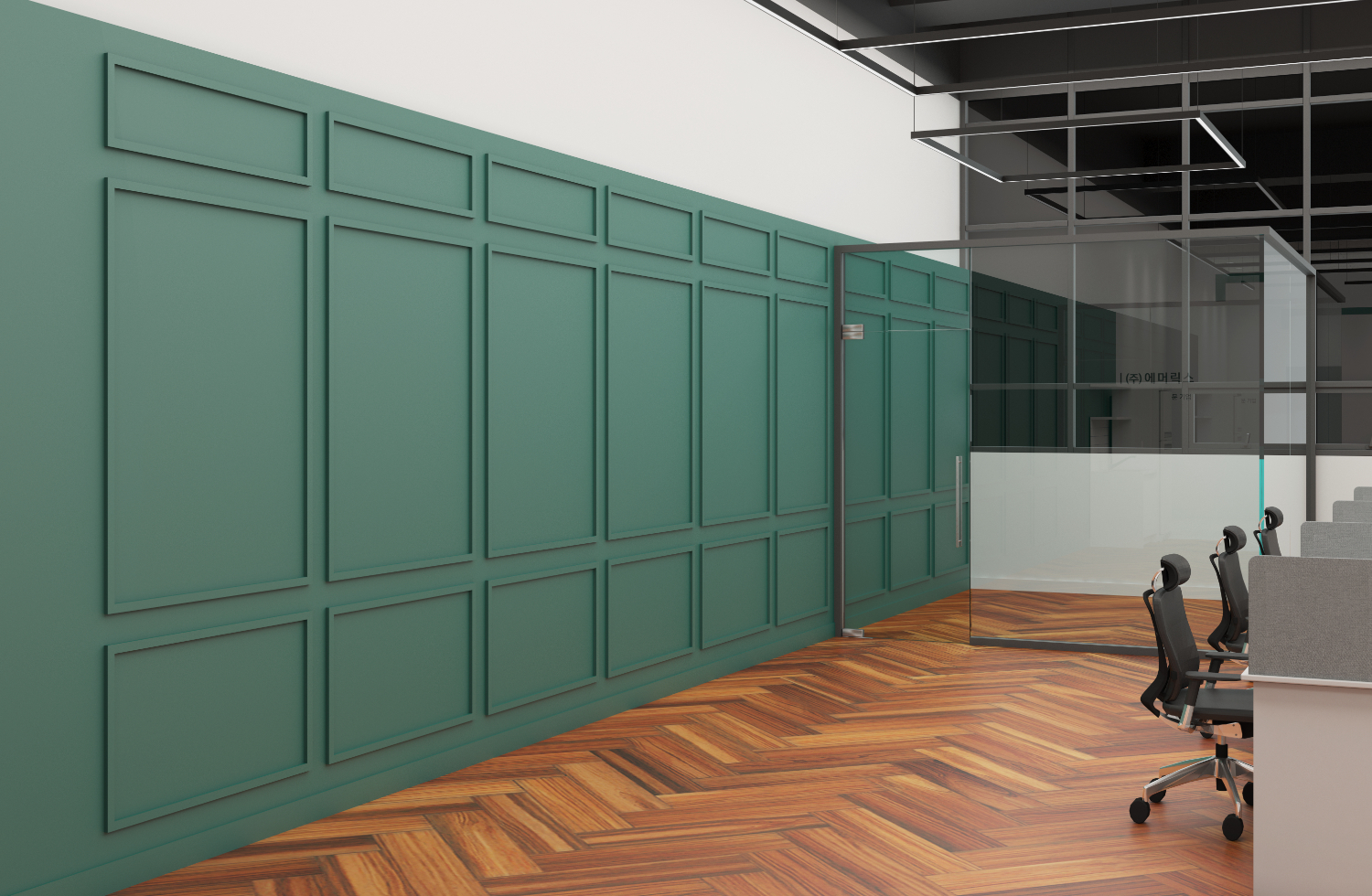 직원들이 밤낮으로 열정을 쏟아부을 안산 안양 의왕 사무실인테리어의 사무공간은 헤링본 바닥과 그린컬러의 조화가 가장 눈에 띄었는데요. 보통 헤링본컬러와 웨인스코팅 연출은 북유럽 인테리어나 클래식한 무드에 많이 사용되는 조합으로 옛스러운미가 느껴지면서도 트렌디하다고 할 수 있습니다. 그리고 자연적인 색조화가 마음을 편안하게 만들어주고 사람의 집중도를 높여준다고 하는데요.