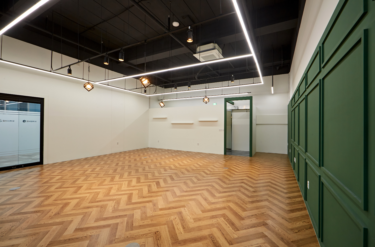중앙문으로 들어서면 보이는 공간입니다. 가장 먼저 반겨주는 것은 그린컬러와 웨인스코팅 연출로 만들어진 가벽이며, 어김없이 골드컬러로 양각처리된 로고가 반겨주는데요. 그 위에는 벽등으로 집중을 높여주었으며 천장에는 전체 라인 조명이 철제 프레임과 연결되어서 전반적으로 밝혀주고 있었습니다.