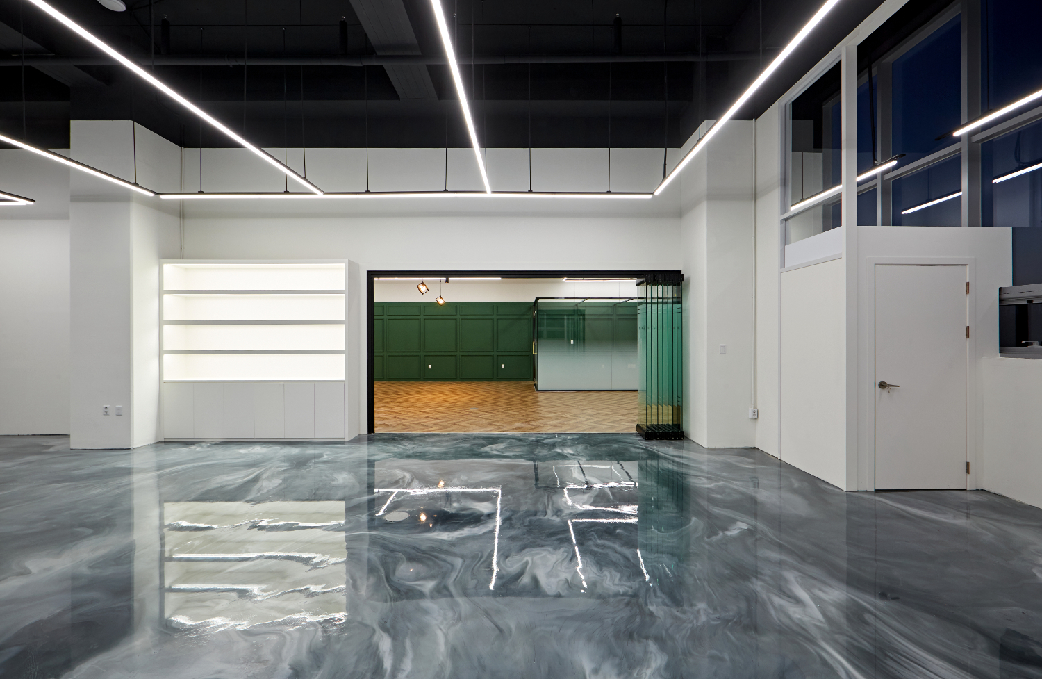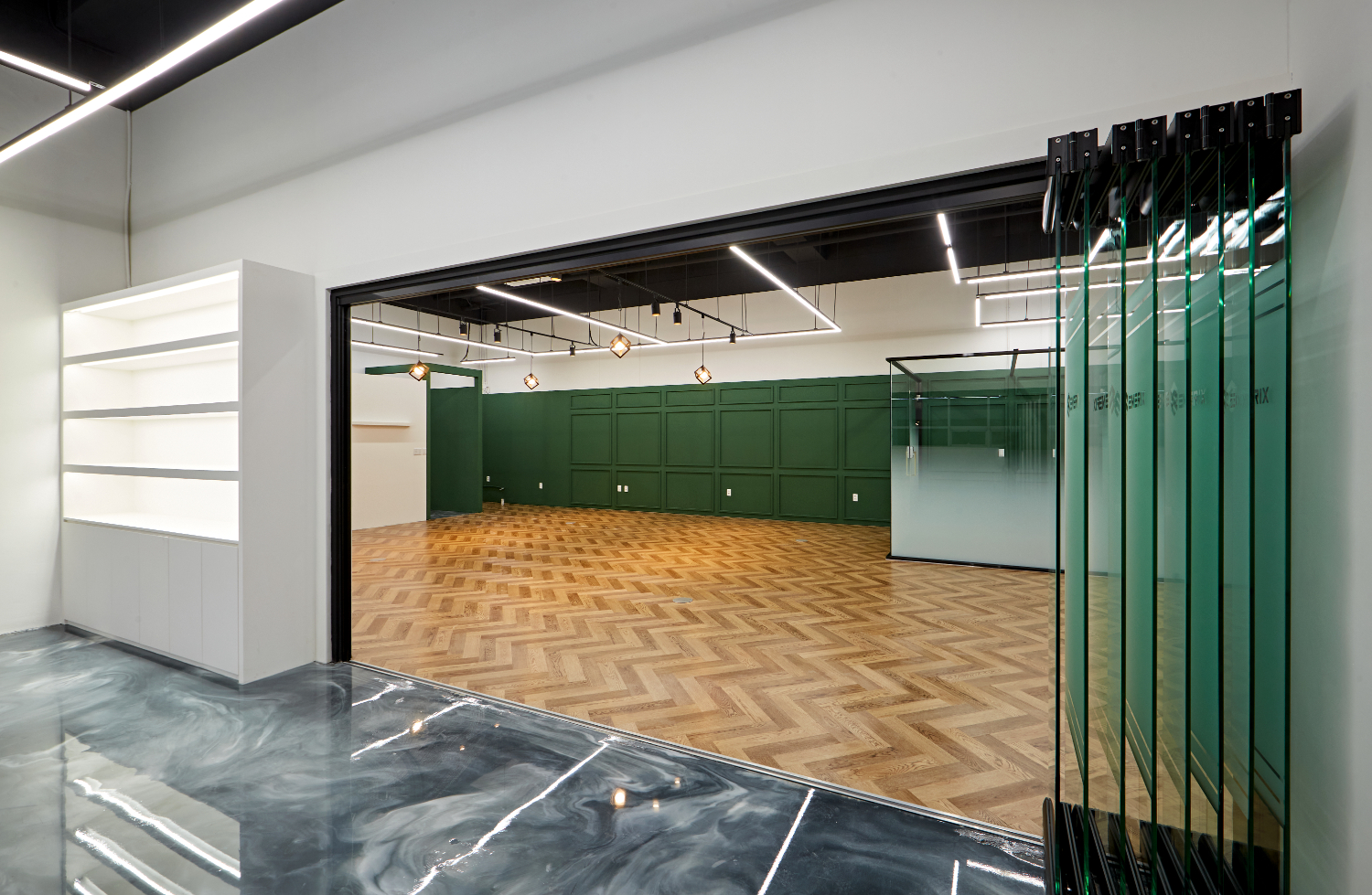 이 곳의 특징이라면 다른 곳에서는 쉽게 볼 수 없는 바닥재라고 할 수 있는데요. 살짝 푸른색이 느껴지는 대리석바닥은 자유로운 느낌의 무늬가 소용돌이치고 있으며 그에 알맞게 심플한 화이트 인테리어가 조화를 이루고 있는데요. 금방 헤링본 바닥으로 만들어진 공간과는 아예 다른 느낌을 보여주는 안산 안양 의왕 사무실인테리어라고 할 수 있습니다.