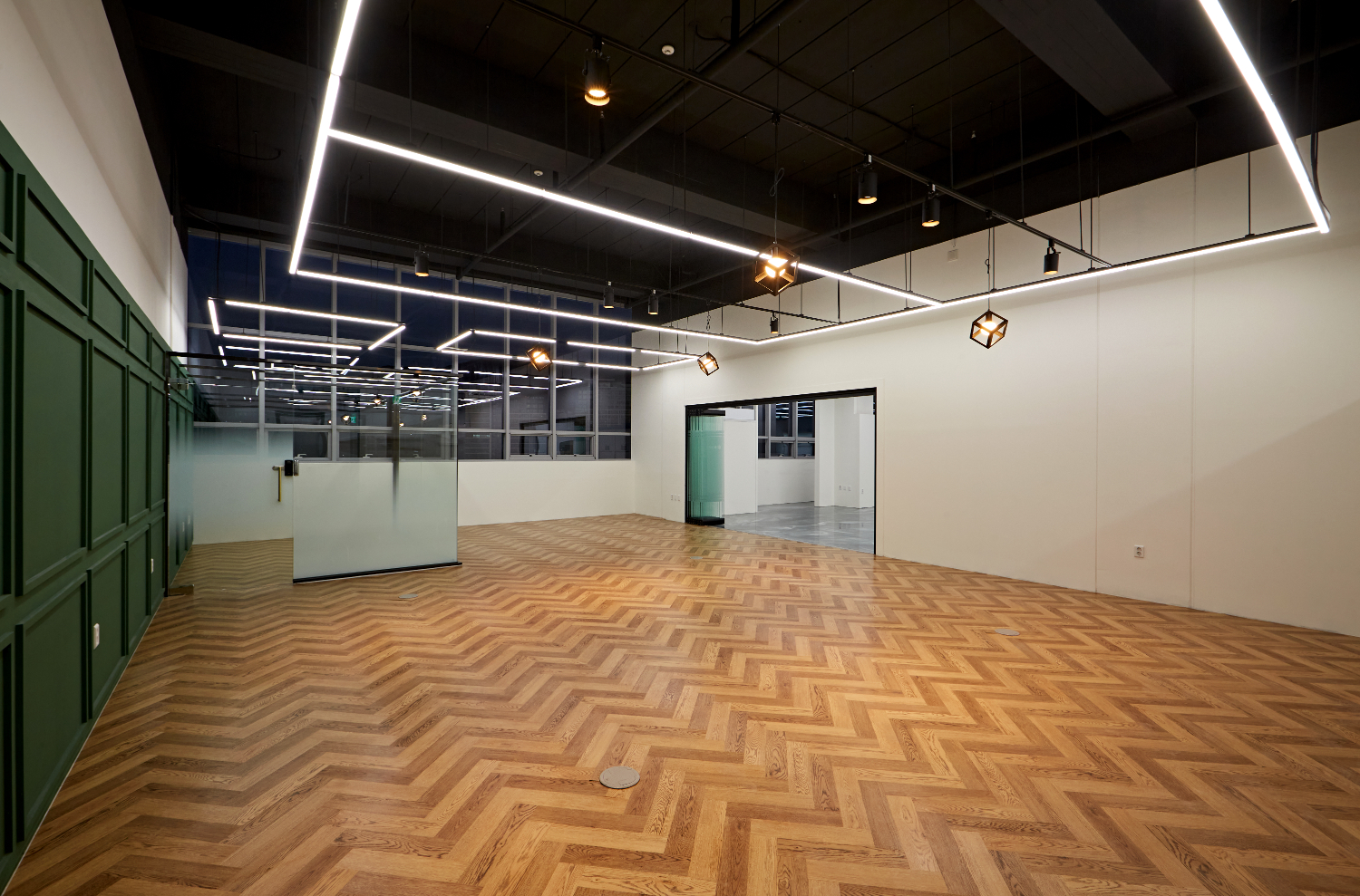 그리고 위에서 보신것 처럼 여기 안산 안양 의왕 사무실인테리어현장에는 세 가지의 공간으로 분리되어있으면서도 서로 연결 되어 있음을 알 수 있는데요. 외부에서만 나뉘어져있는 것이 아니라 내부에서도 자유롭게 이동이 가능합니다. 그리고 해당 문은 유리로 되어 있기에 더욱 서로 친밀도르 높일 수 있으며 개방감을 높여주고 있죠. 노출 시공으로 지어진 천장은 블랙으로 도장하여서 현대적인 느낌을 더하였고 팬던트 조명과 라인 조명을 혼합하여서 설치하였습니다.