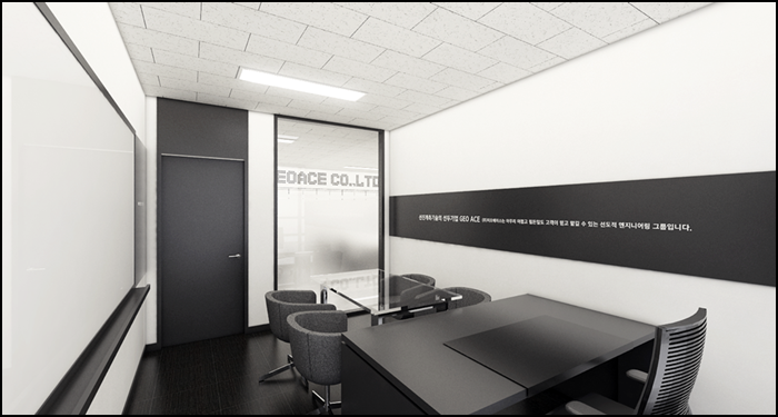 검정색 외벽으로 막아놓은 회의실은 실내에 들어가면 오히려 화이트톤의 스타일링으로 구성이 되어있습니다. 하지만 화이트톤 외벽의 중앙에 검정색 띄를 넣음으로서 세련미를 한 층 더하였으며 바닥도 검정색 바닥을 이용하여서 회의실의 무거움을 한 층 더 추가해보았습니다. 가구 인테리어도 검정색 톤으로 배치하여 바닥과 이어지는 무거운 느낌을 더하였습니다.