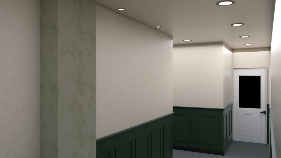 학원 영역의 복도 모습입니다. 전체적으로 화이트 벽면에 하단 딥그린 컬러의 웨인스코팅을 시공해 고급스러움을 강조했고 바닥은 빈티지 노출형으로 시공해 디자인적 균형을 맞췄습니다. 벽면과 문에는 강의실을 쉽게 찾을 수 있도록 사인물을 시공해 동선을 유도함으로써 가독성을 높였습니다.