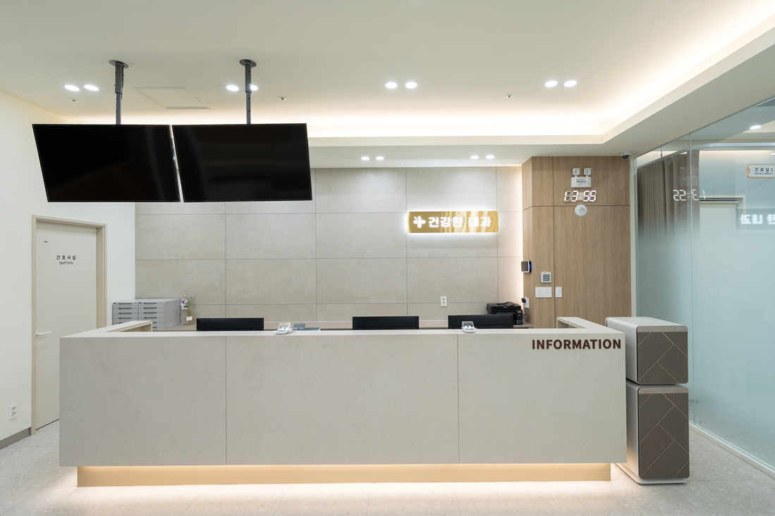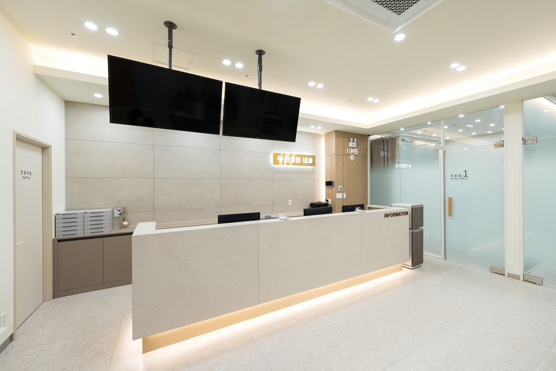 병원의 첫인상을 결정짓는 인포메이션 데스크는 대리석 타일 마감으로 깔끔하면서도 고급스러운 분위기를 연출했습니다.