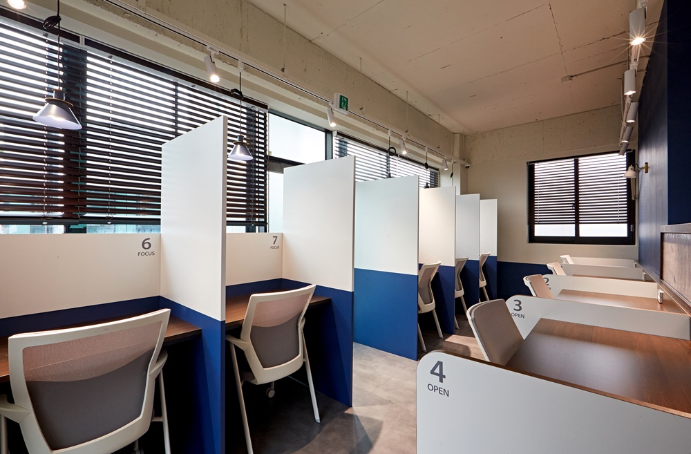 먼저 개인좌석을 독립적인 공간으로 구성하여 학생들이 주변 소음에 방해받지 않고 공부할 수 있도록 했습니다.