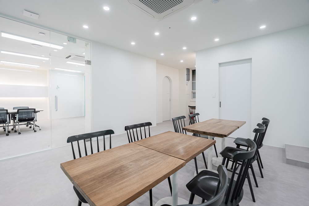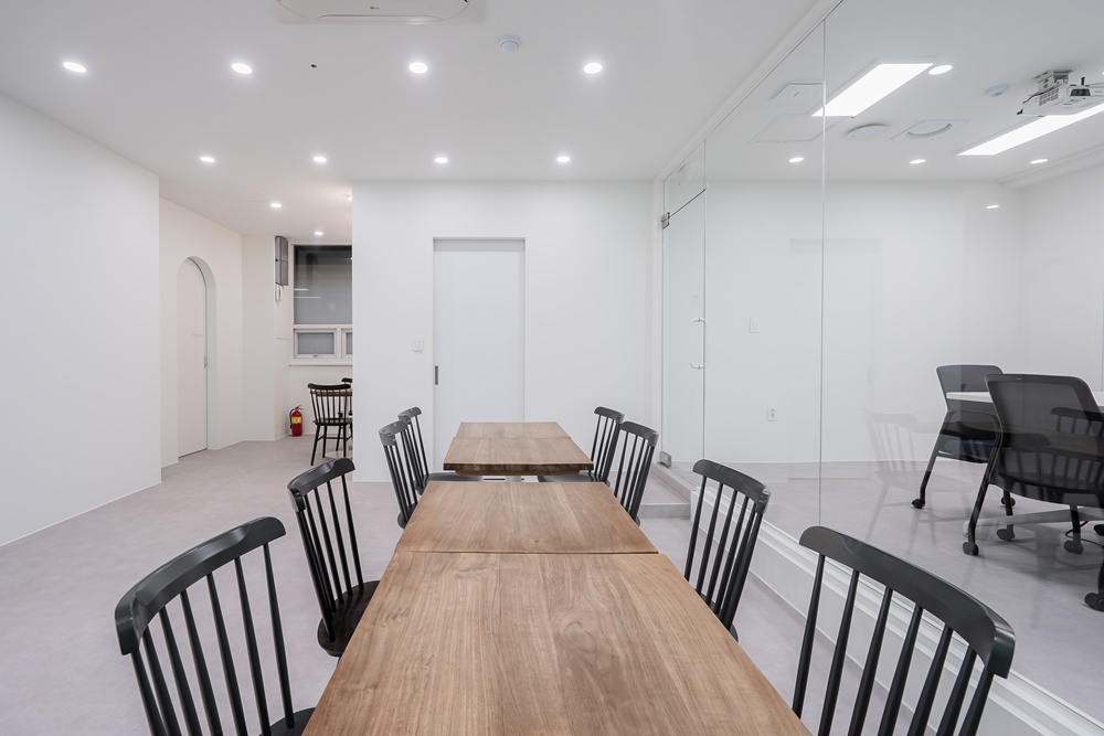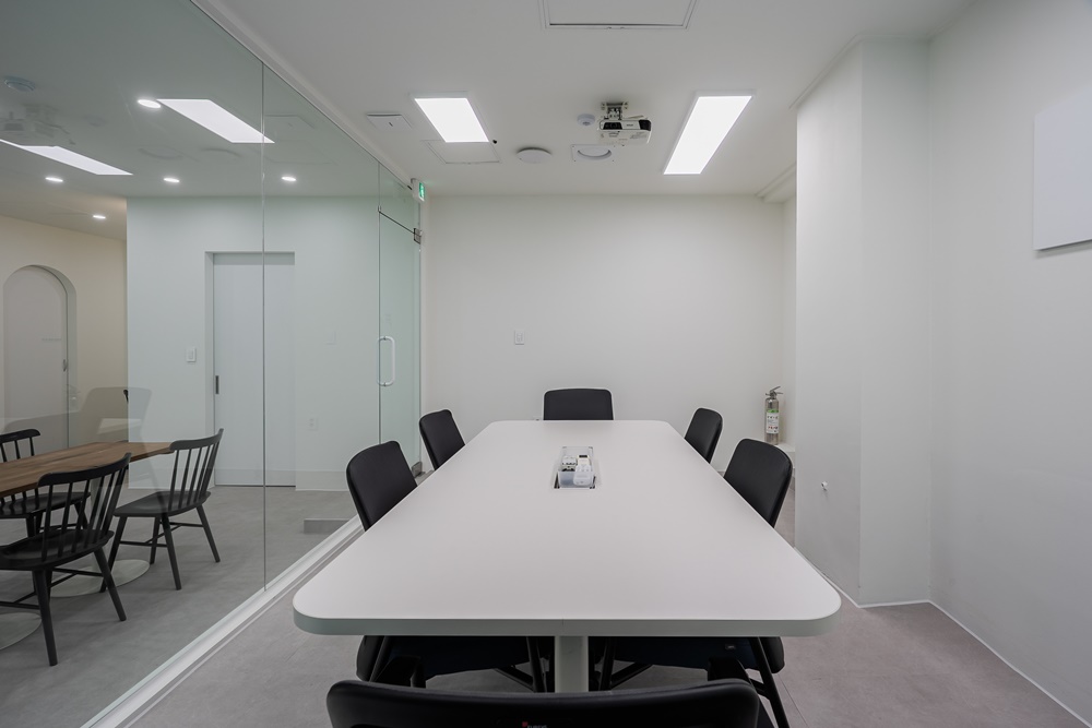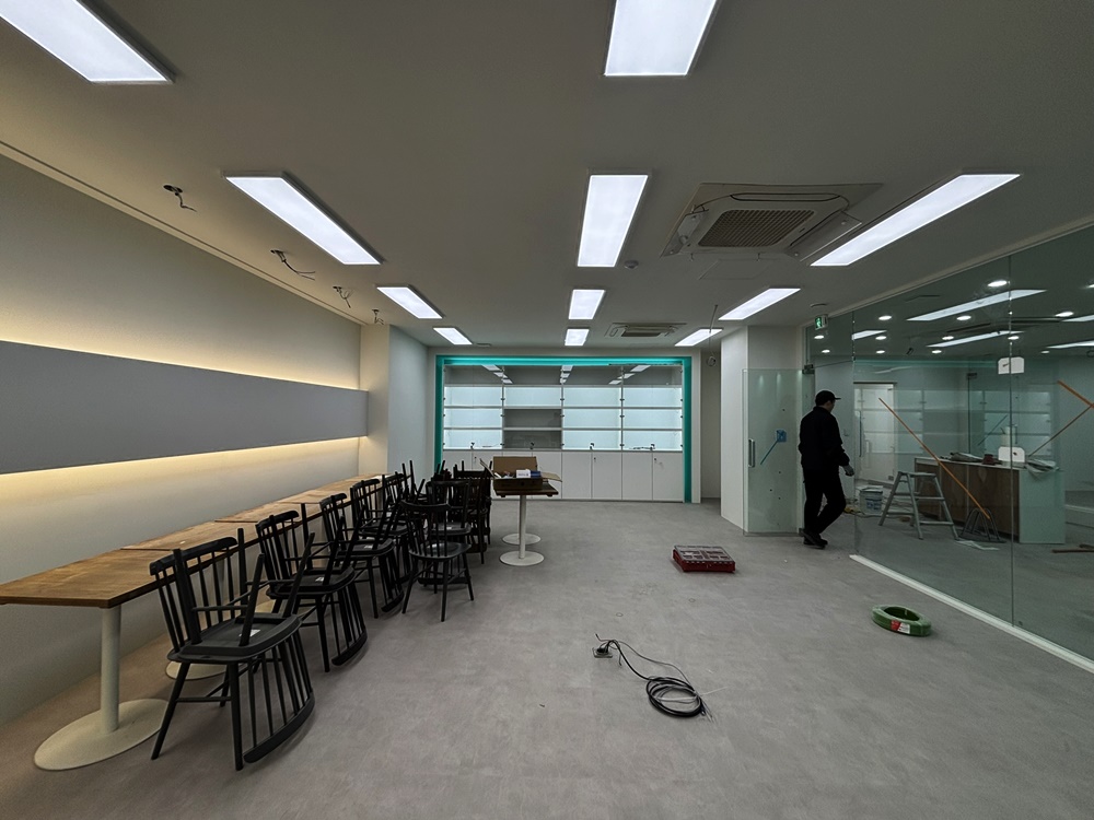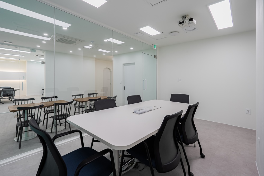 추가로 천장 조명은 간접조명과 직부등을 조화롭게 배치해 회의실과 업무 공간 모두 밝고 편안한 조도가 유지되도록 했어요.