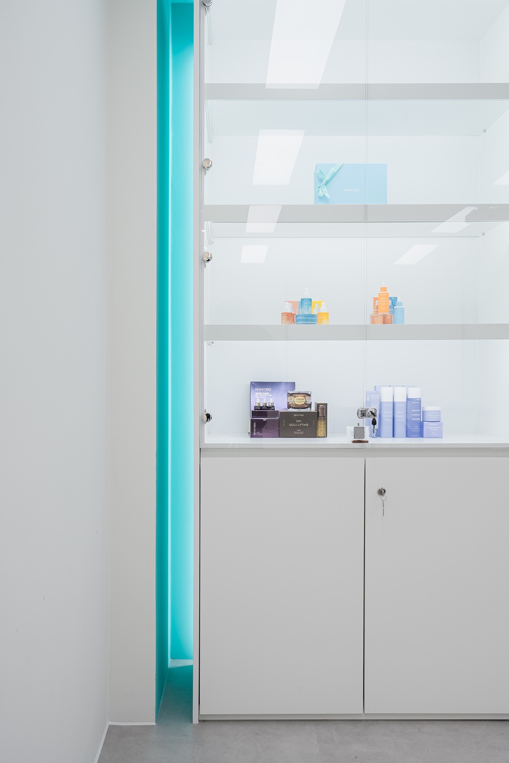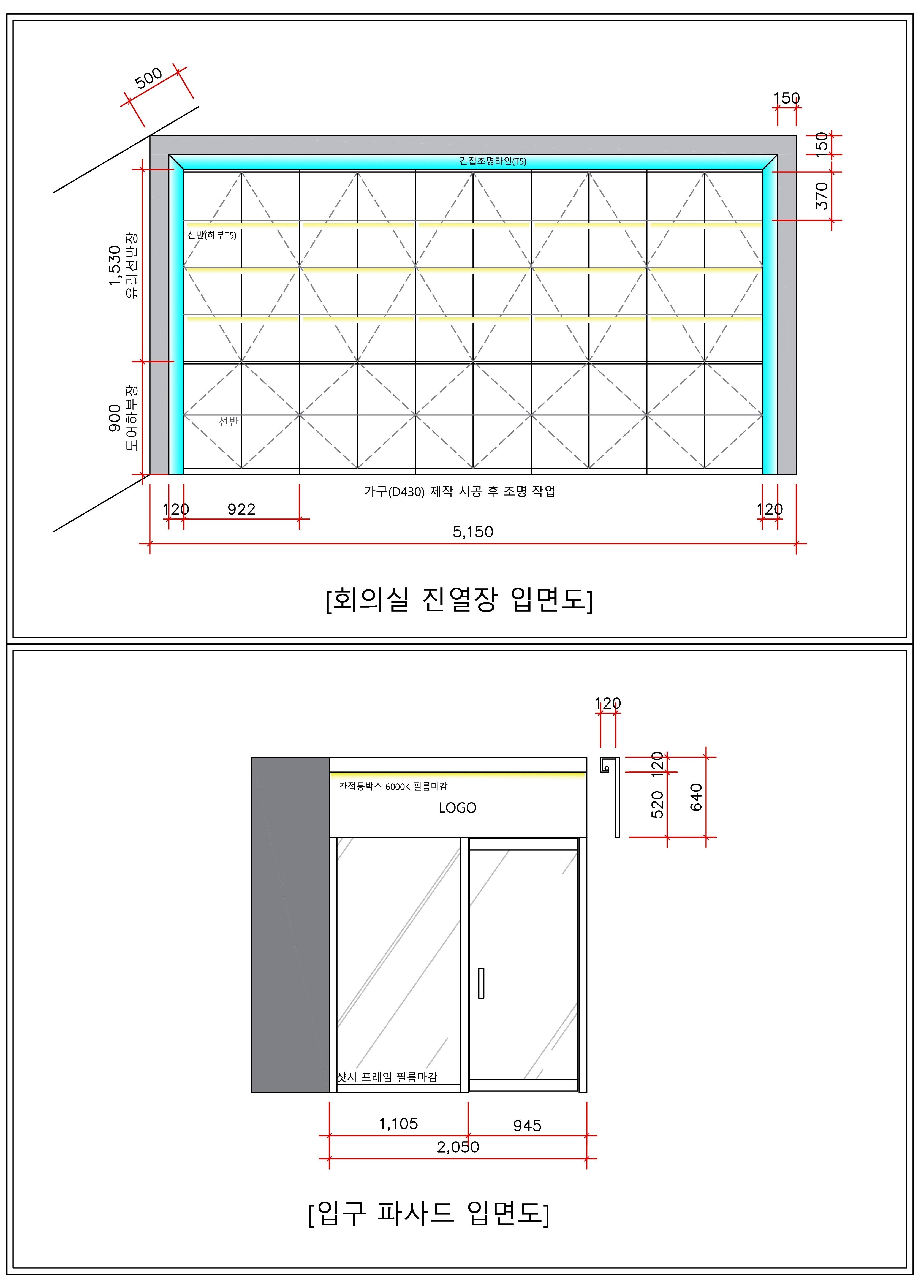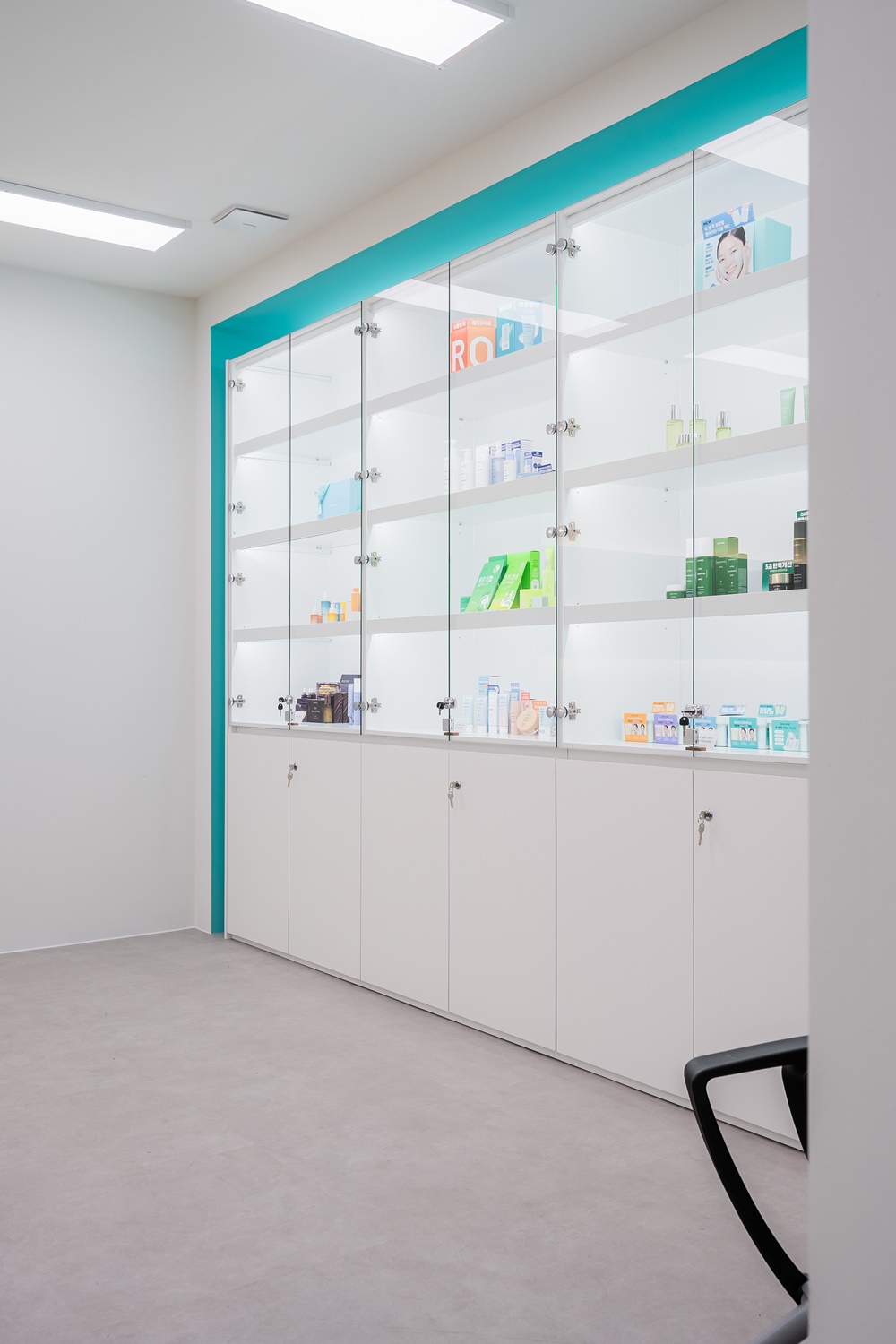 상부는 유리장과 조명을 넣어 제품이 돋보이게 구성했고, 하부는 화이트 수납장으로 실용성을 강화했어요.