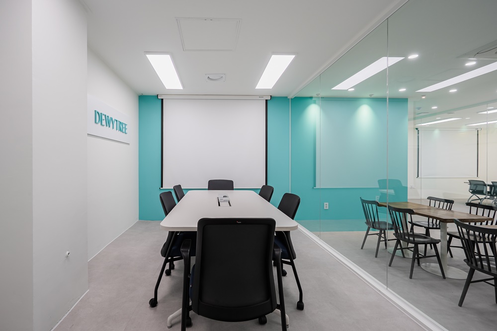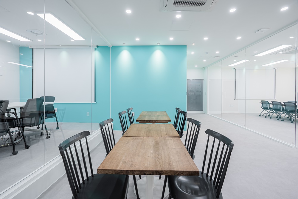 개방형 회의실 공간은 유리 파티션 덕분에 시각적으로 넓어 보이고 답답함이 없어요.
