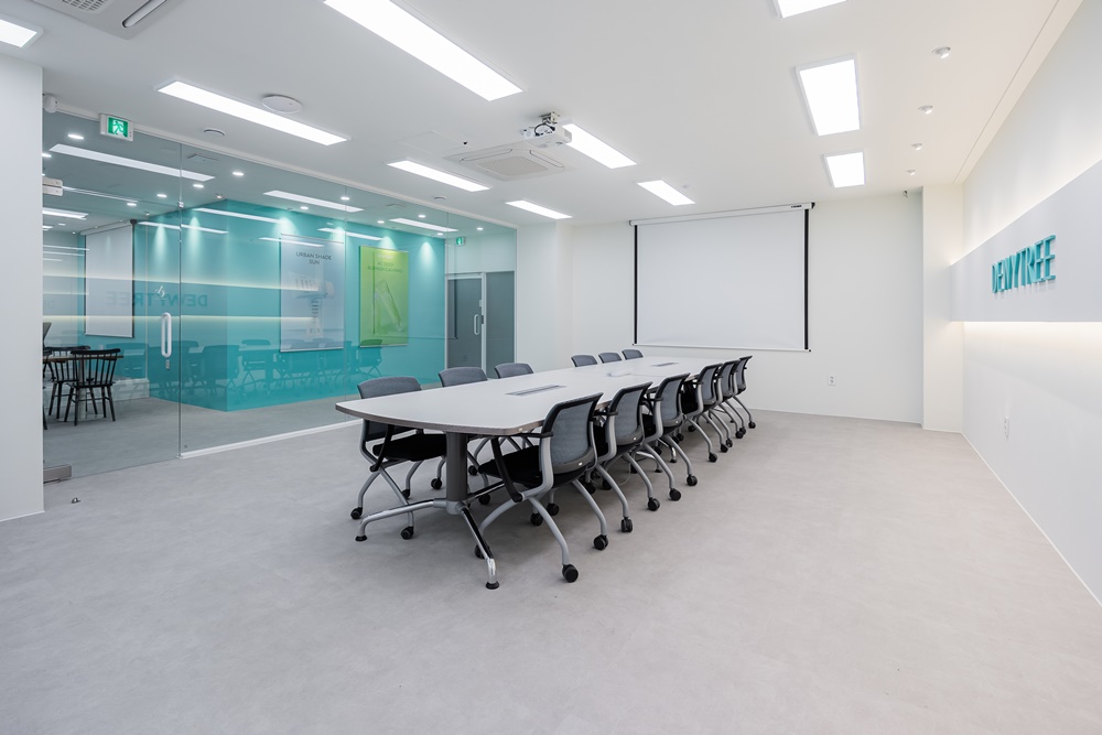 특히 민트 컬러 포인트와 유리 파티션을 활용한 개방형 회의실에 디테일이 담겨있답니다.