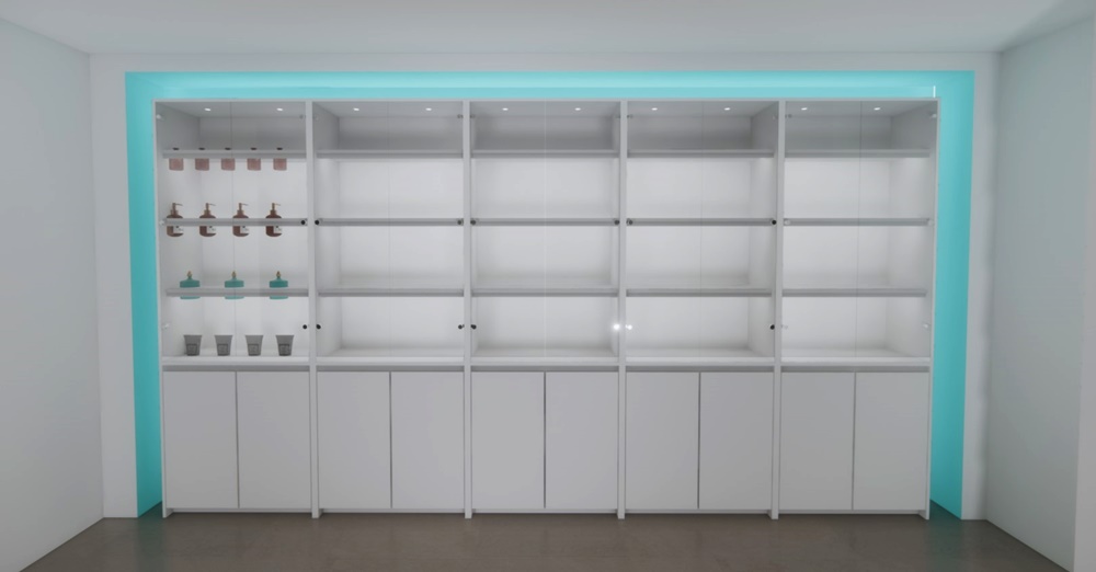 하부 화이트 수납장은 실용적인 수납 공간을 제공하고, 상부 유리장 조명은 제품을 더 입체적이고 고급스럽게 보여줘요.