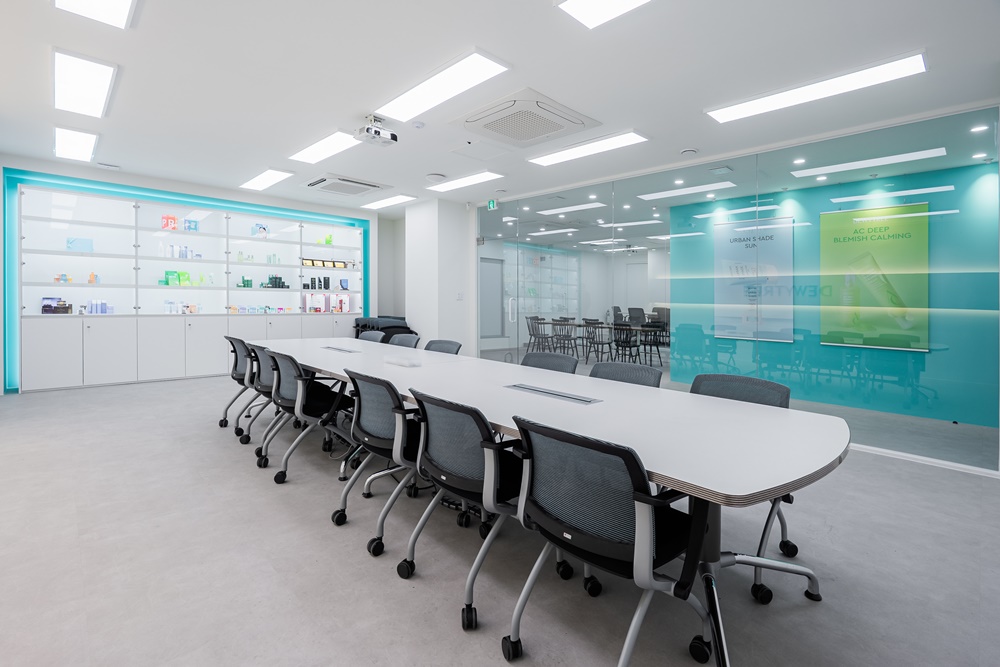 브랜드 전시 수납장, 개방형 회의실 설계, 민트 포인트 벽면, 유리 파티션 등 다양한 요소가 조화롭게 적용되며 회사의 이미지와 업무 효율까지 향상되는 결과를 가져왔죠.