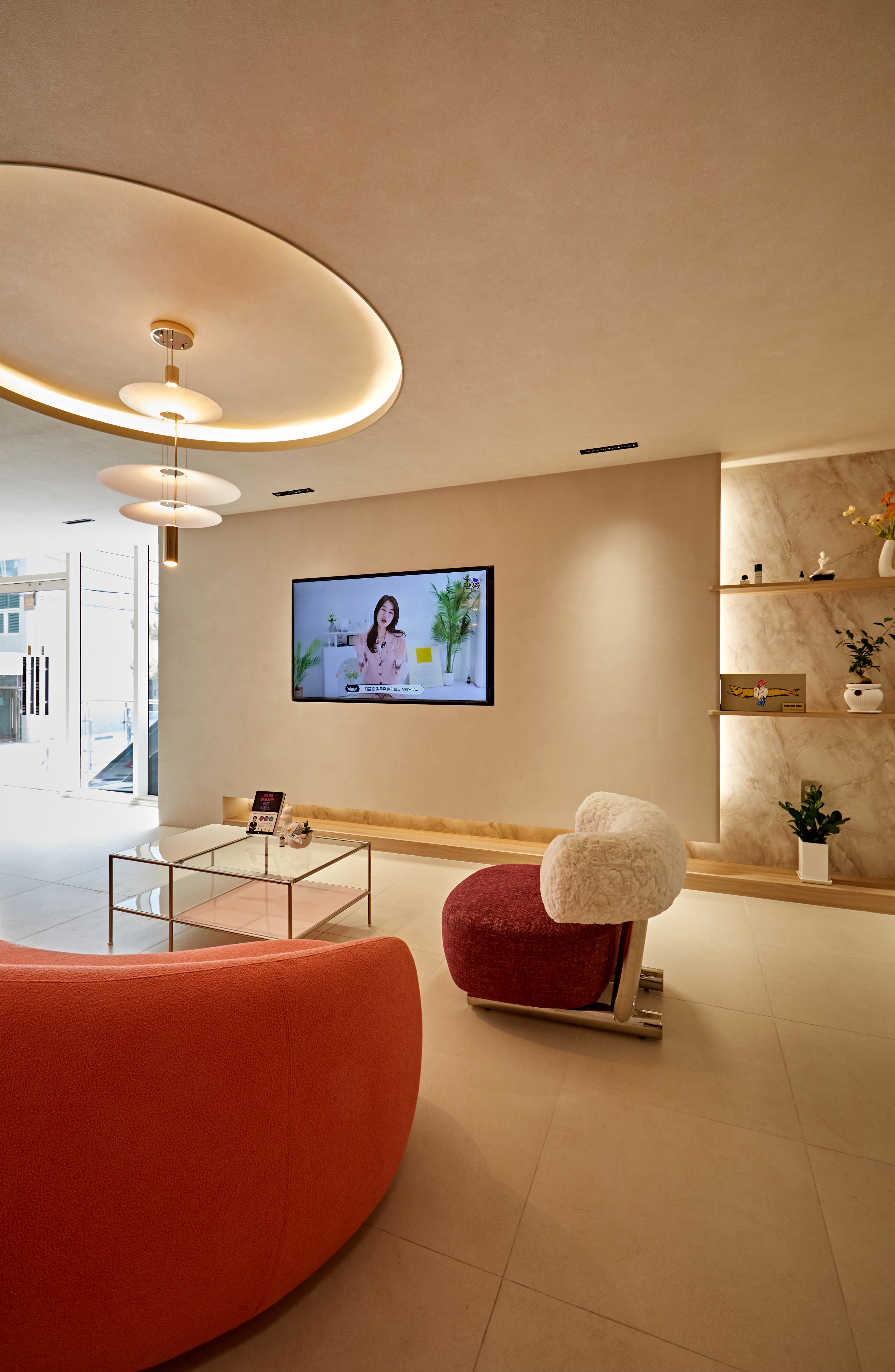 부드럽고 유려한 곡선형 소파를 배치해 고객이 기다리는 동안 편안하게 머물 수 있도록 했고 천장에는 원형 조명과 은은한 간접 조명을 조화롭게 설치해 공간 전체가 밝고 고급스럽게 느껴지도록 했죠.