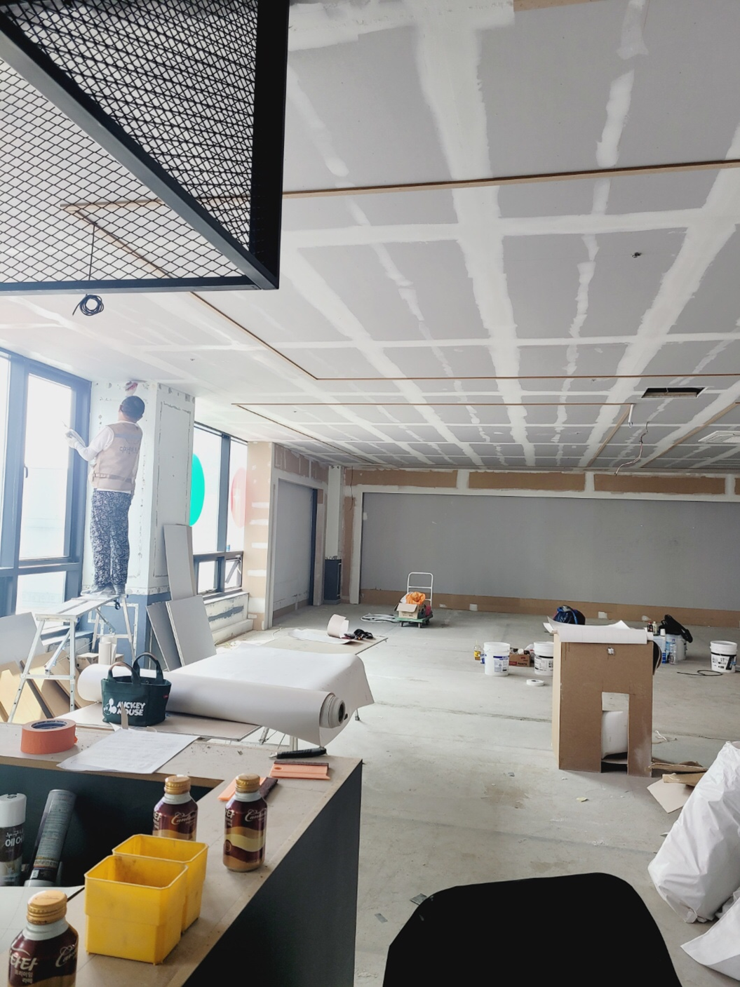 천장 구조 작업과 함께 라인 조명 매입을 위한 프레임 시공도 진행되었으며,