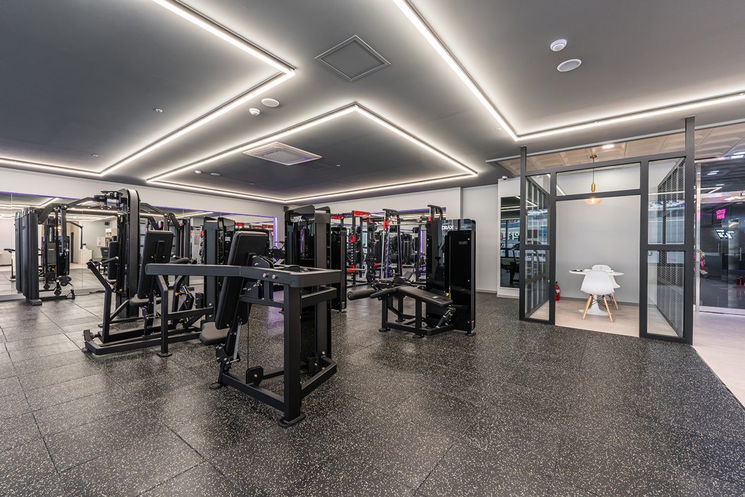 헬스장 내부 전반은 네모 형태의 라인 조명을 활용하여 공간별로 분위기를 구분했습니다.