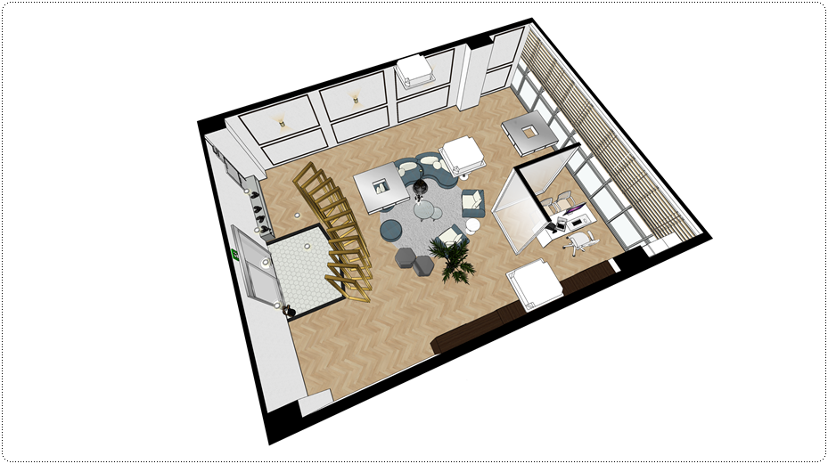 입구를 왼편에 두고 봤을 때의 3D 설계도입니다. 전체적으로 오픈형으로 계획했고 입구에 아트월을 계획해 내부 공간과 분리했으며 중앙에 손님을 응대하고나 회의를 할 수 있는 리셉션 공간이 있습니다.