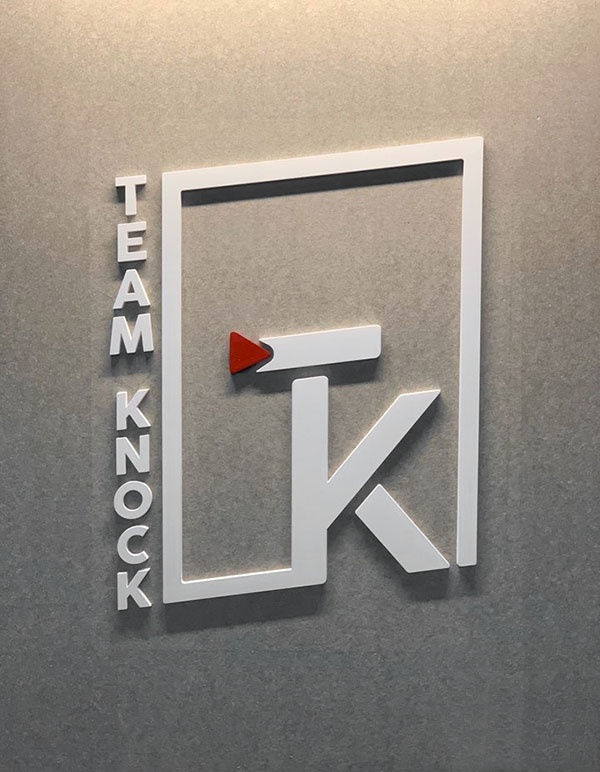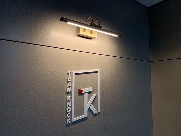 깔끔한 디자인의 회사로고에 돋보일 수 있도록 벽등을 설치하였습니다. 어두울 수 있는 공간이지만 벽등 설치로 화사함이 더해졌습니다.