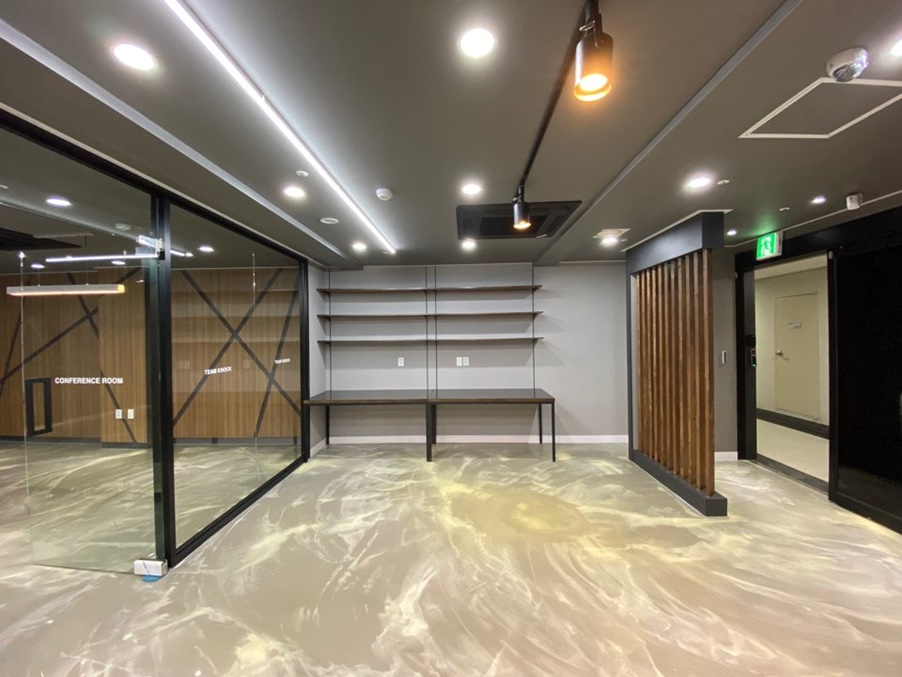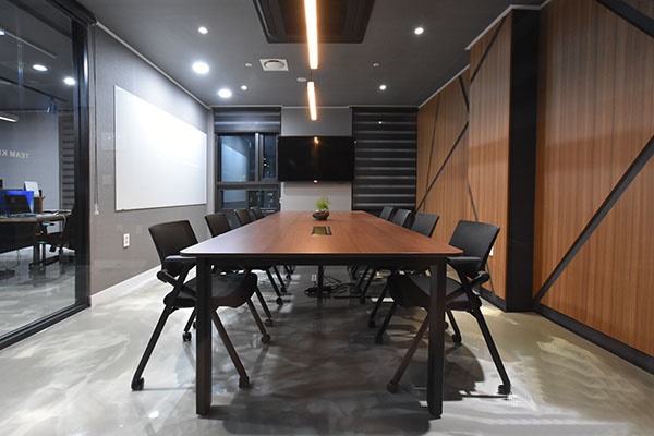 회의실로 사용될 공간으로 테이블 위쪽에 심플한 조명 설치와 합께 벽면 디자인과 비슷한 컬러와 분위기를 보여주는 테이블 의자 배치로 공간의 완성도가 높아졌습니다.
