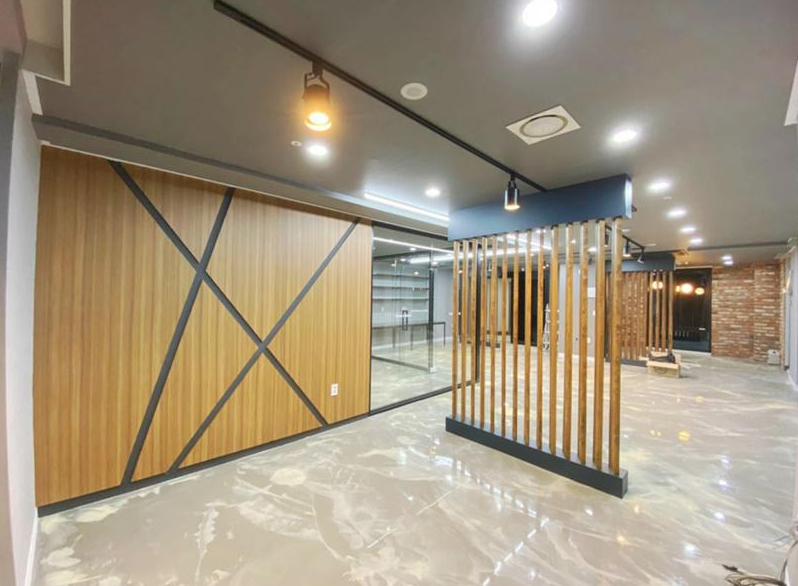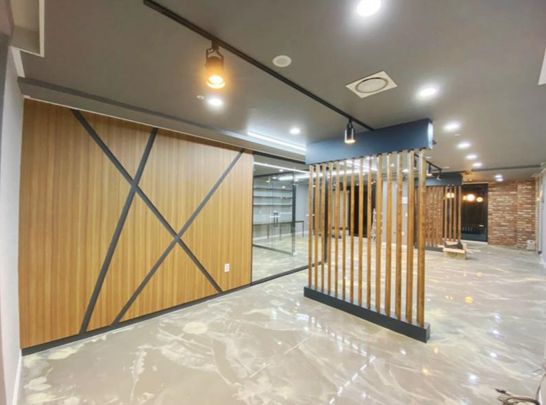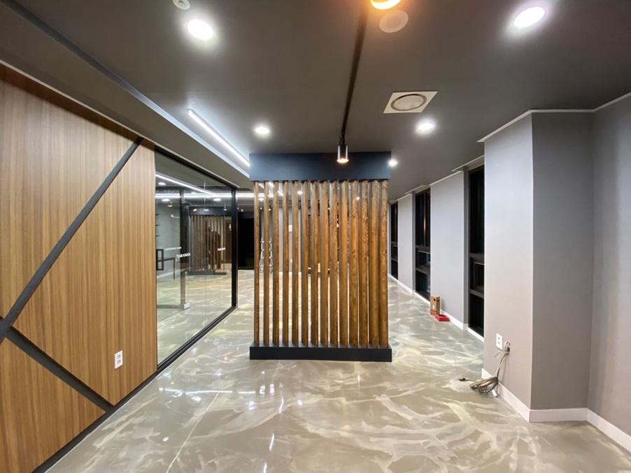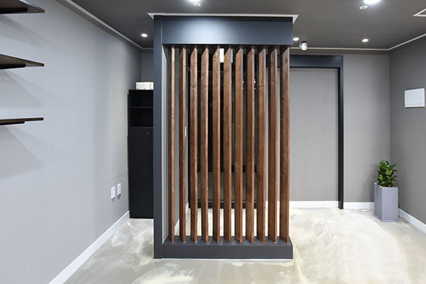 입구에 설치된 파티션입니다. 간살무늬 디자인으로 시공하여 답답해 보이지 않는 모습 보실 수 있습니다. 이번 현장의 경우 각 공간마다 분리를 위해 같은 디자인의 파티션을 설치하였습니다. 그로 인해 전체적으로 공간이 깔끔해 보이며 통일감이 느껴져 안정적이게 연출되었습니다.