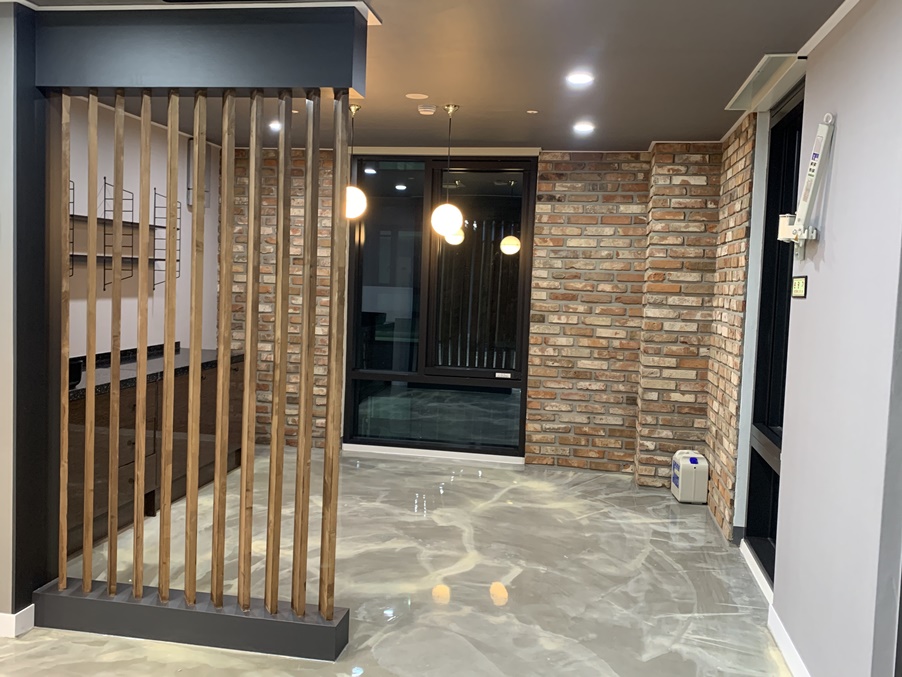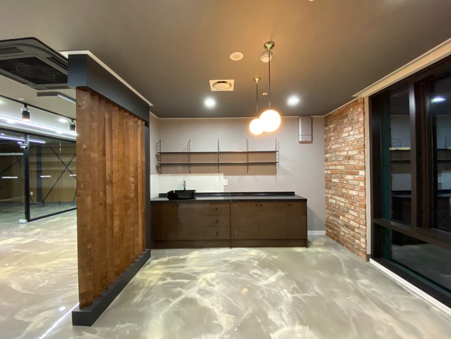 휴게실로 사용될 공간으로 벽면에 벽돌 디자인을 더해 빈티지함을 연출하였습니다. 그리고 앞쪽 부분에 간살 무늬 우드 파티션으로 분리해 주었으며 한쪽 벽면에는 수납공간을 채워 실용성을 높였습니다. 그리고 따스한 불빛의 펜던트 조명으로 공간을 더욱더 아늑하게 연출하였습니다.
