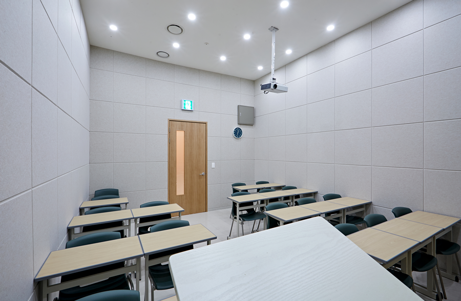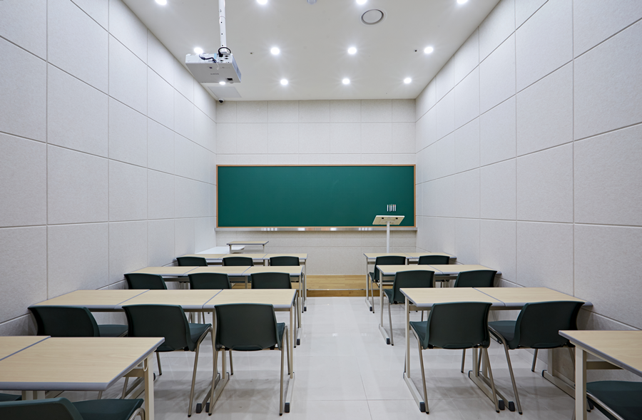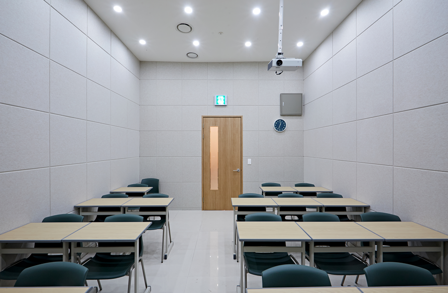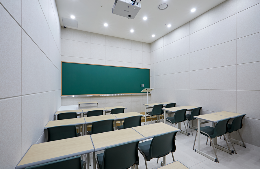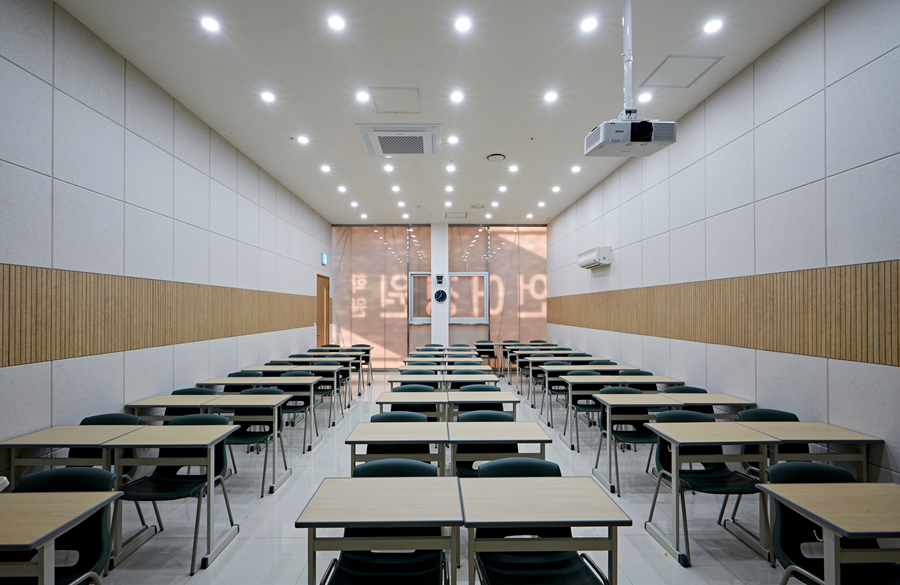 각 강의실에는 충분한 양의 LED 조명을 설치하였으며, 자연광을 최대한 활용할 수 있도록 창문을 적절하게 배치하였습니다. 또, 칠판 옆에는 보조 조명을 설치하여 판서 내용이 선명하게 보이도록 했습니다.