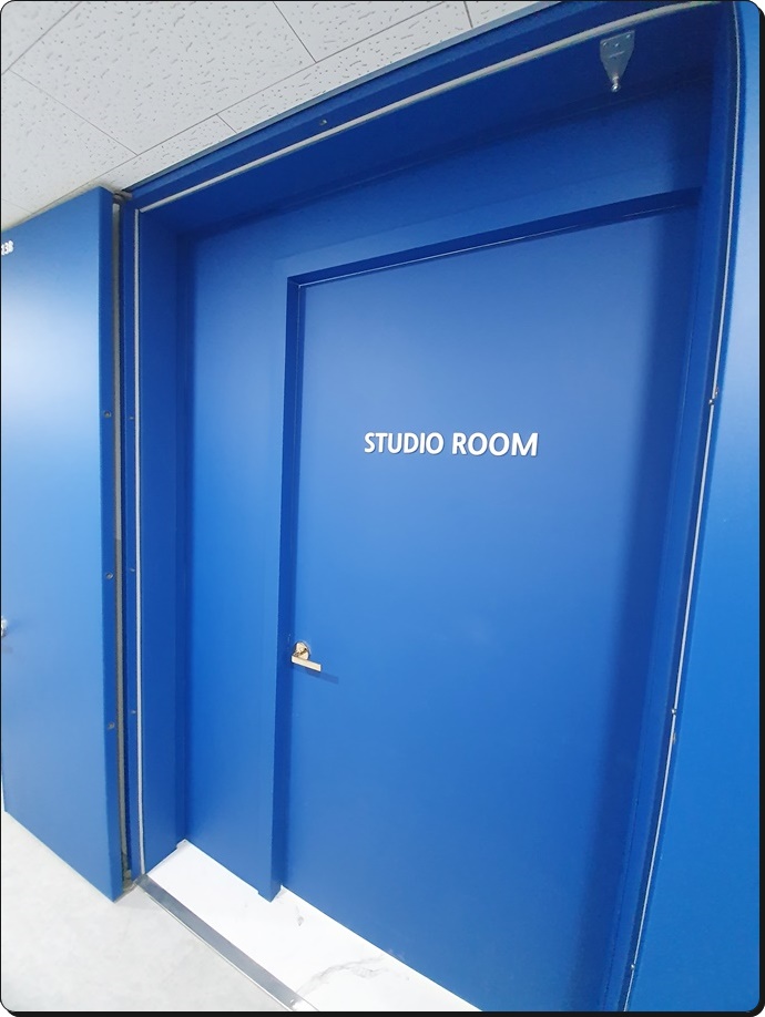 스튜디오는 회의실 및 촬영 스튜디오로 활용하는 공간임을 고려해 출입문을 강화문 안쪽에 파사드와 같은 블루계열의 철문으로 시공해 외부에서 봤을 때, 하나의 공간으로 인식되도록 했습니다.