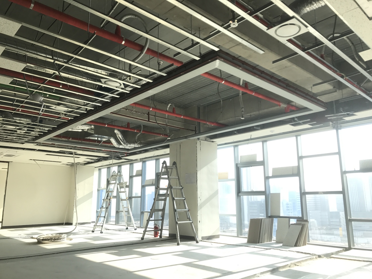 자, 그럼 지금부터 공사 현장을 함께 확인해보겠습니다. 천정 및 전기 공사를 위해 기존 텍스 철거 작업을 진행하였고 사무 업무 공간 외에는 석고보드로 천정을 마감하였습니다.