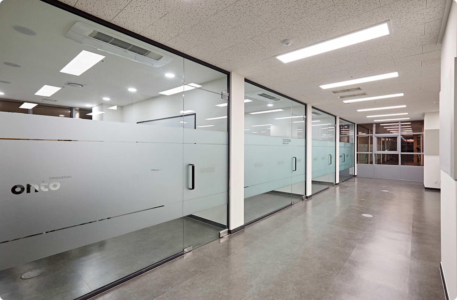 입구에서 들어오면 내부로 들어가는통로로 사무실의 얼굴이라고도 할 수 있는데요. 입구에는 기업의 인증서, 수상경력 등연혁을 확인할 수 있도록 수납장을 구성하였습니다.또한 안쪽에도 간접등을 설치하여 사무실에 들어서자마자 잘 보일수 있도록 만들었습니다. 복도를 따라 안쪽으로 들어오면 사무실의 메인 공간이 나오게 됩니다. 내부를 가벽으로 한번 더 구분하면서 프라이빗한 공간으로 만들었습니다. 아트월은 기업 이미지와 어울리게 깔끔한 화이트로 제작하였습니다.