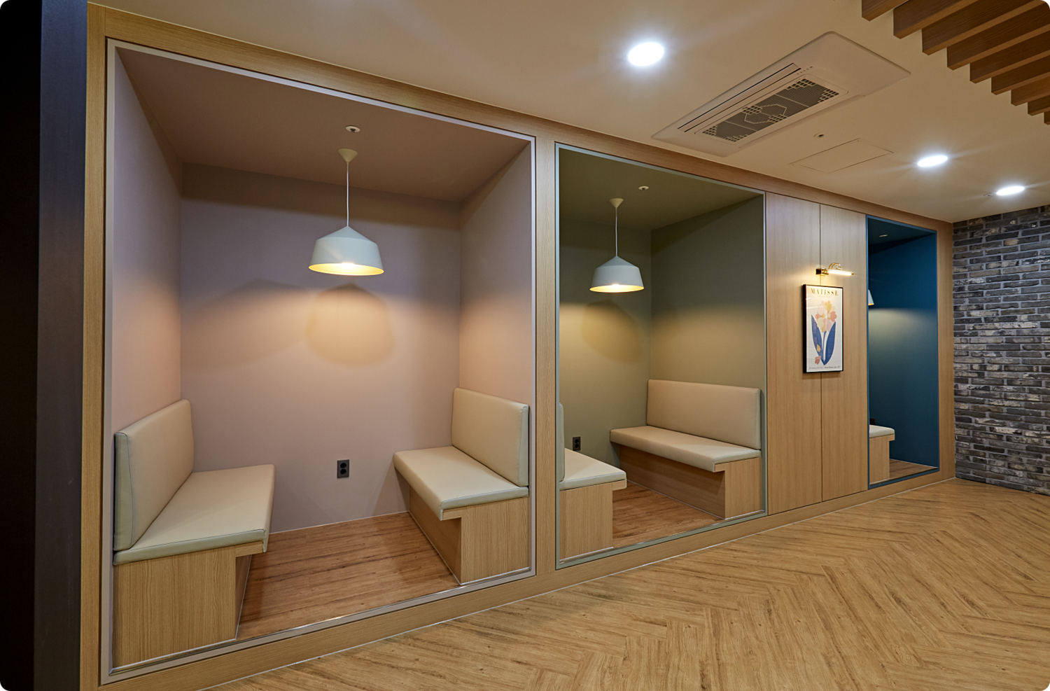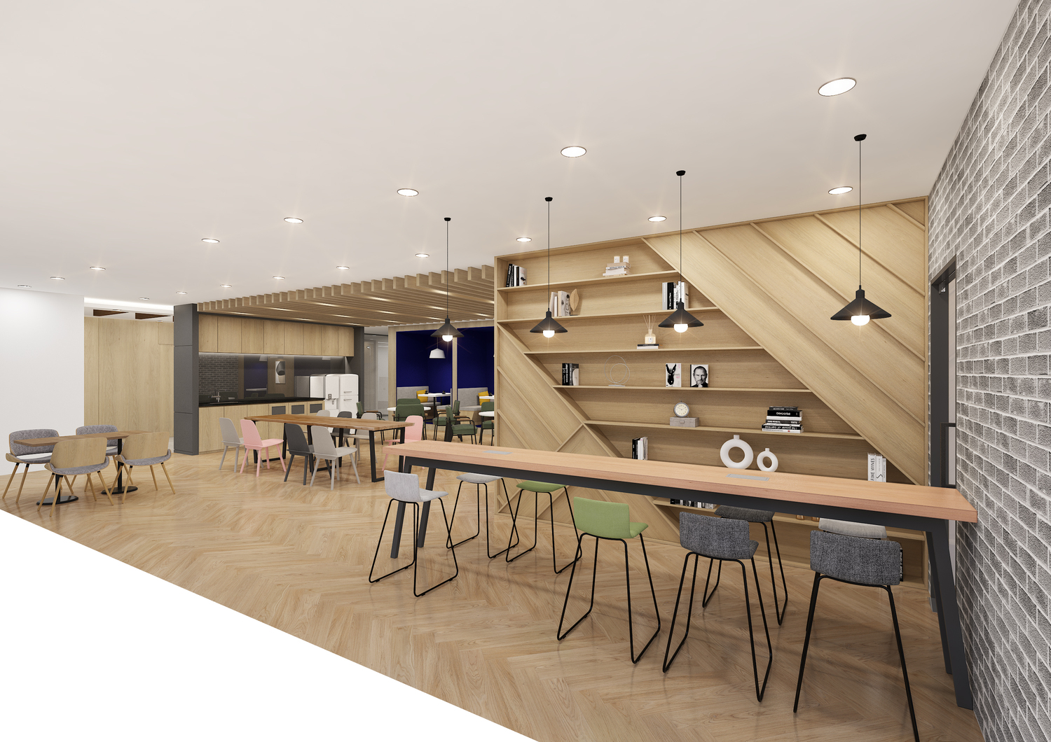 다음은 휴식&미팅 공간인 카페테리아 모습입니다. 우드&벽돌 타입의 디자인으로 따뜻한 감성과 편안함을 주는 공간이 되었습니다.별도의 공간들을 만들어서 다른 사람의 눈치를 보지 않고도 편하게 쉴 수 있으며 간단한 업무를 처리할 수 있기도 하고 직원들끼리의 스몰 토크도 가능합니다.가운데는 오픈형으로 테이블을 배치할 예정이며 한쪽 벽면에는 이렇게 아늑한 공간을 만들었는데요. 팬던트 조명까지 더해져 감성 카페에 온 듯한 느낌입니다.