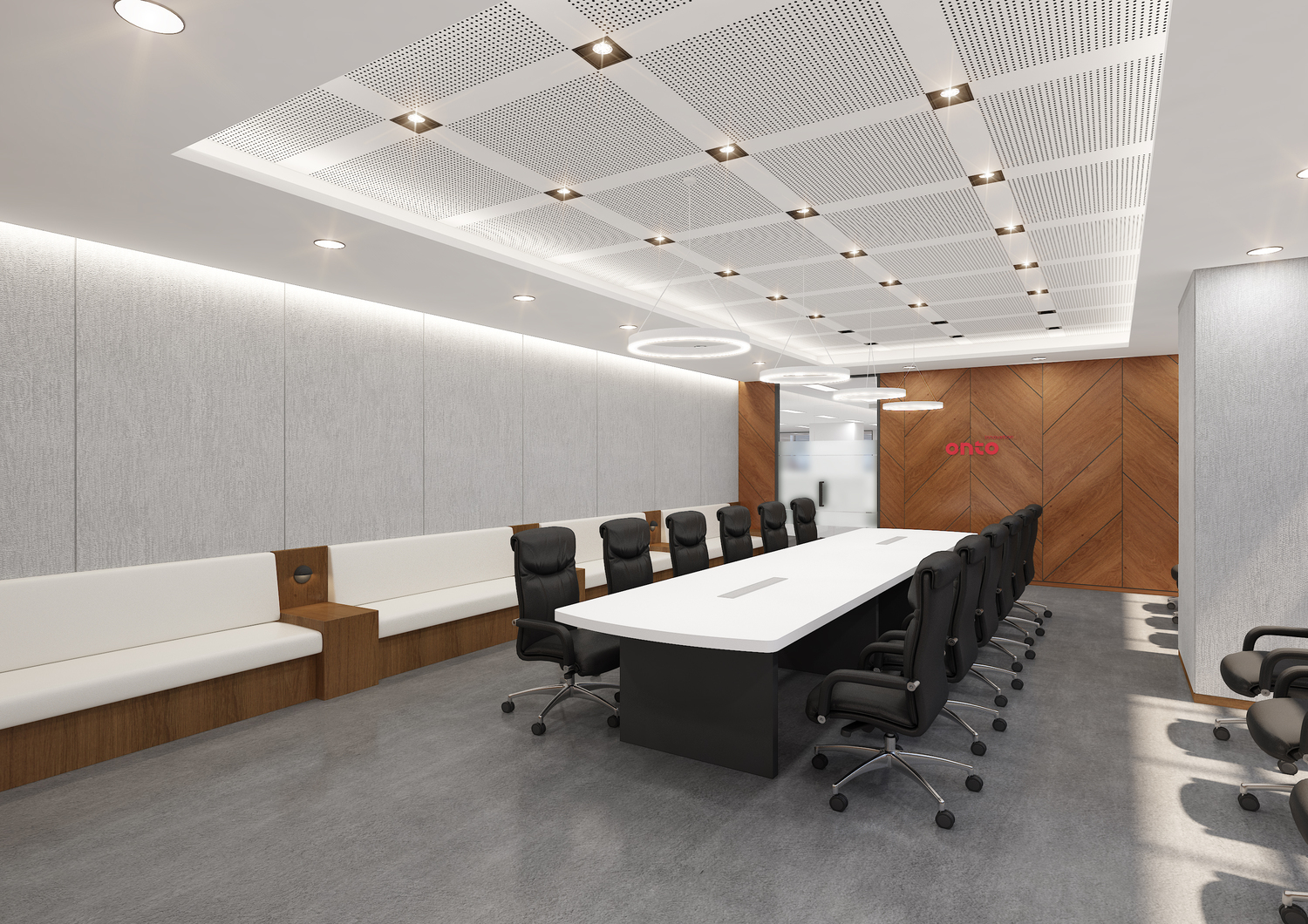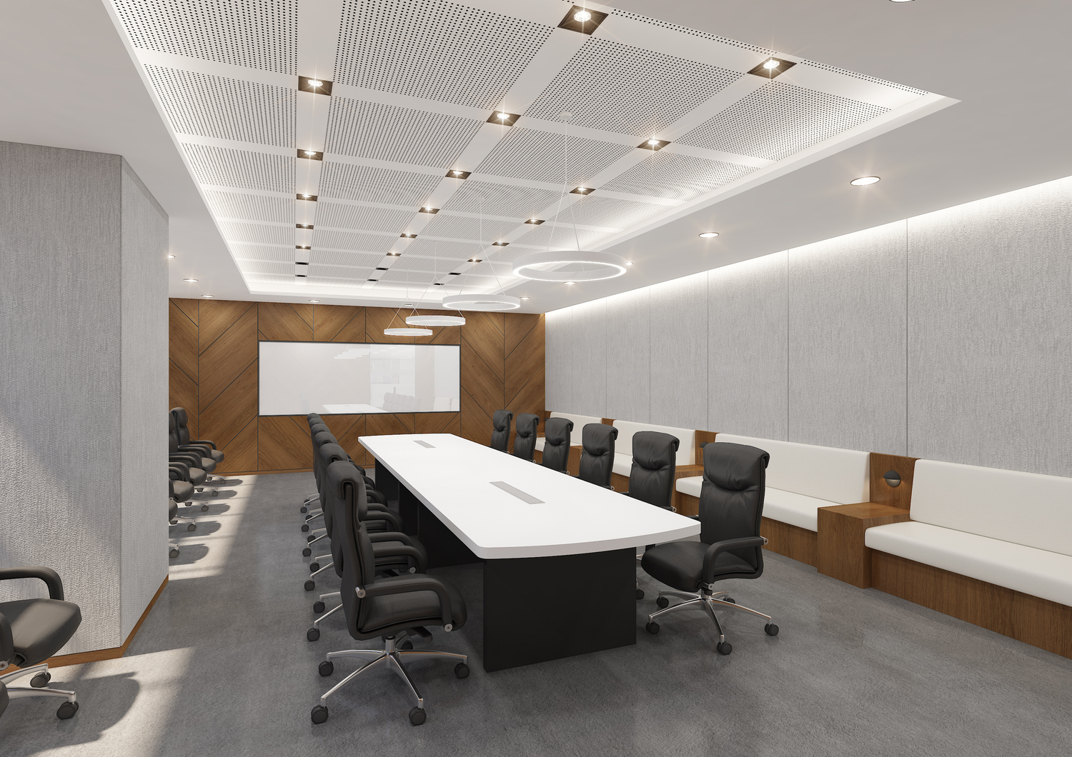 대표실 내 회의 공간 외에도 더 많은 인원을 수용할 수 있는 대회의실과소회의실이 별도로 구성되어 있습니다. 중앙 메인 테이블 외에도 사이드 벽면에 쇼파형 벤치를 추가로 설치하여 활용도를 높였습니다.벽면 디자인과 다양한 조명을 활용하여 모던한 분위기를 연출했습니다. 대회의실 보다는 심플한 느낌의 소회의실입니다. 화이트&그레이 인테리어로 깔끔한 모습입니다.