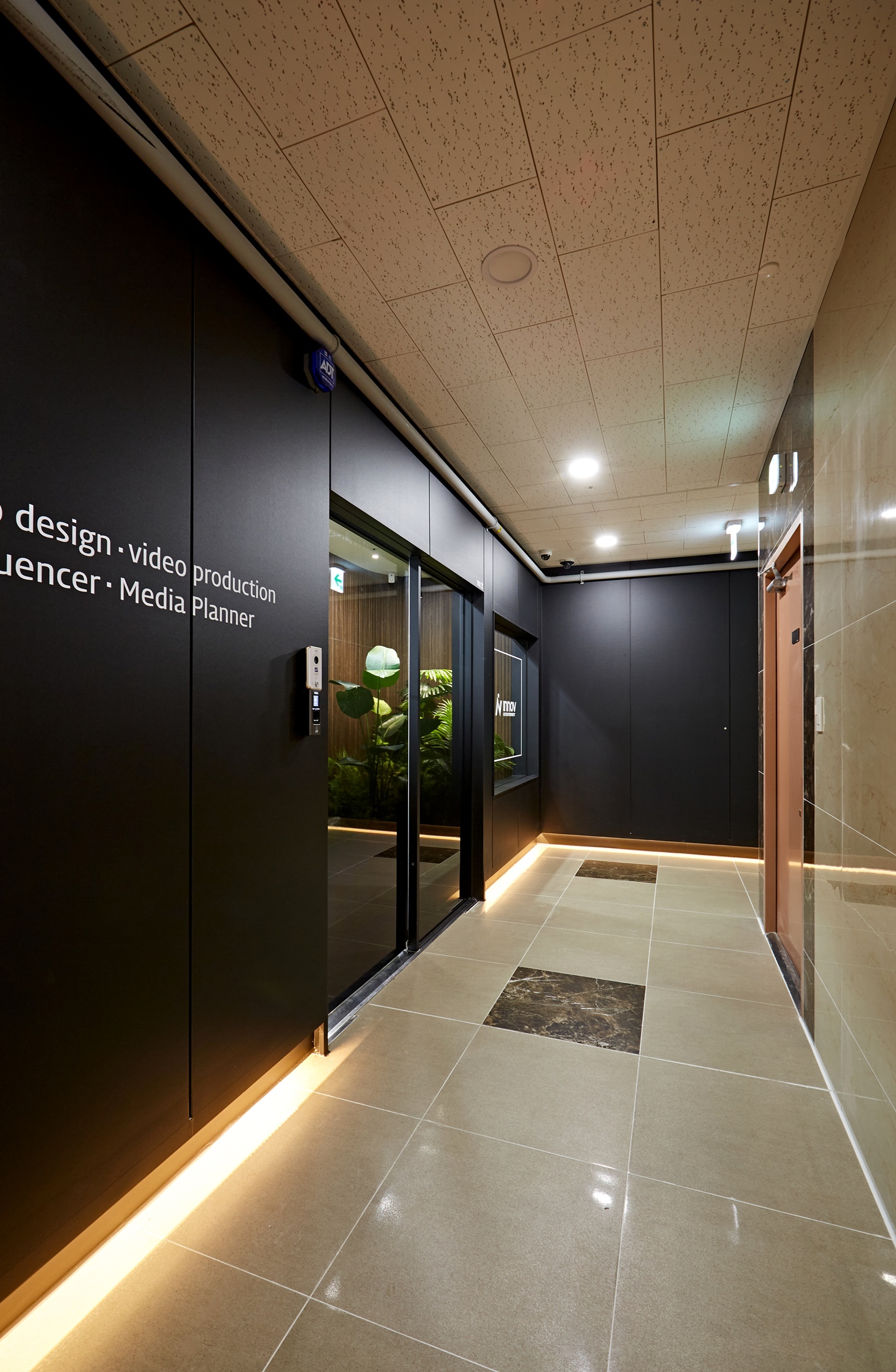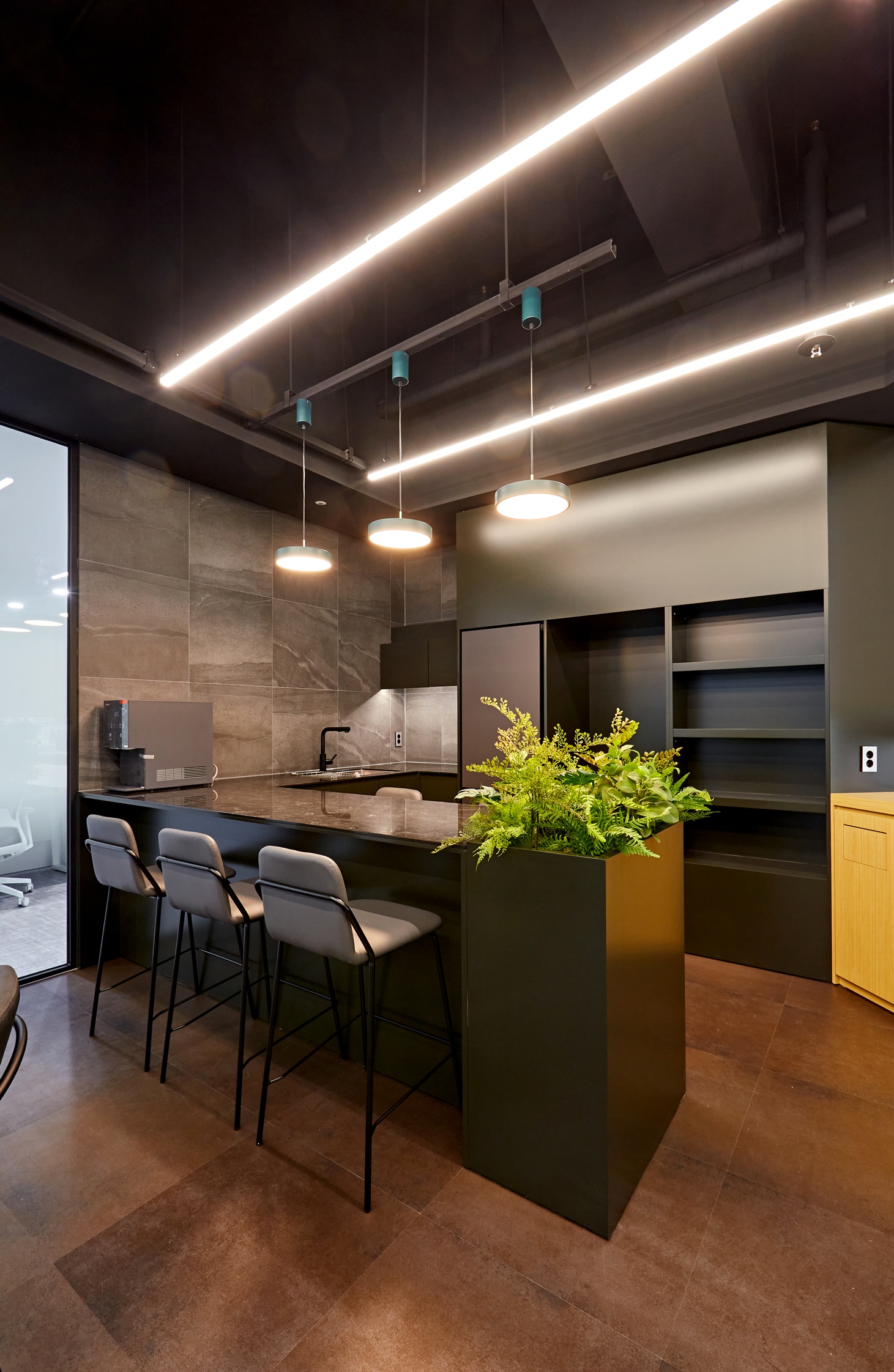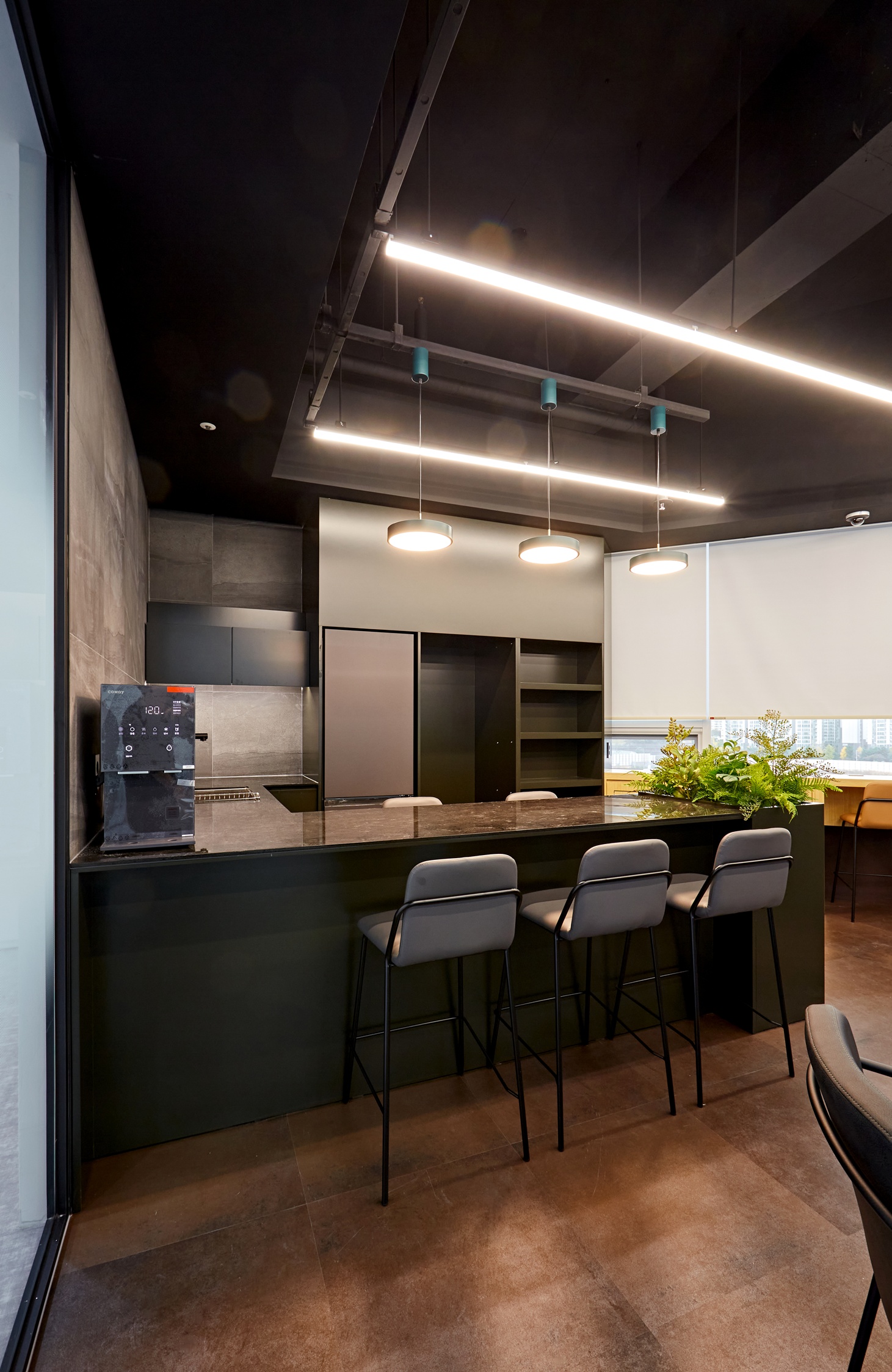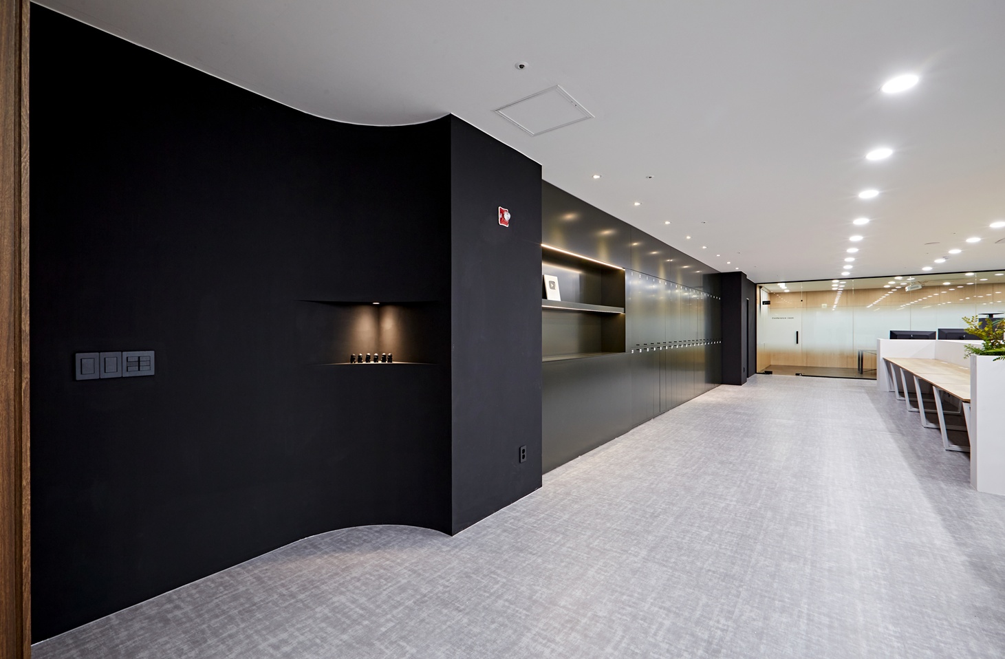 사무실 내부는 블랙 포인트 벽면과 블랙 프레임 유리가벽이 전체 분위기를 압도합니다.