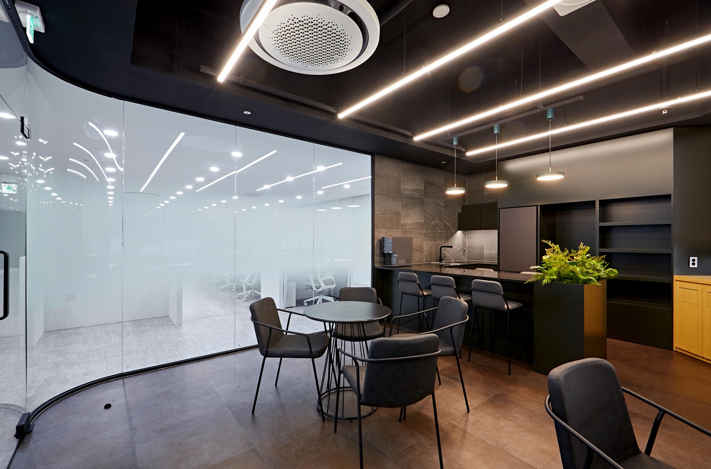 회의실은 유리의 개방감과 블랙 프레임의 선면한 라인이 조화롭게 어우려지며 시각적으로 넓고 시원한 공간감을 만들어 주었으며,