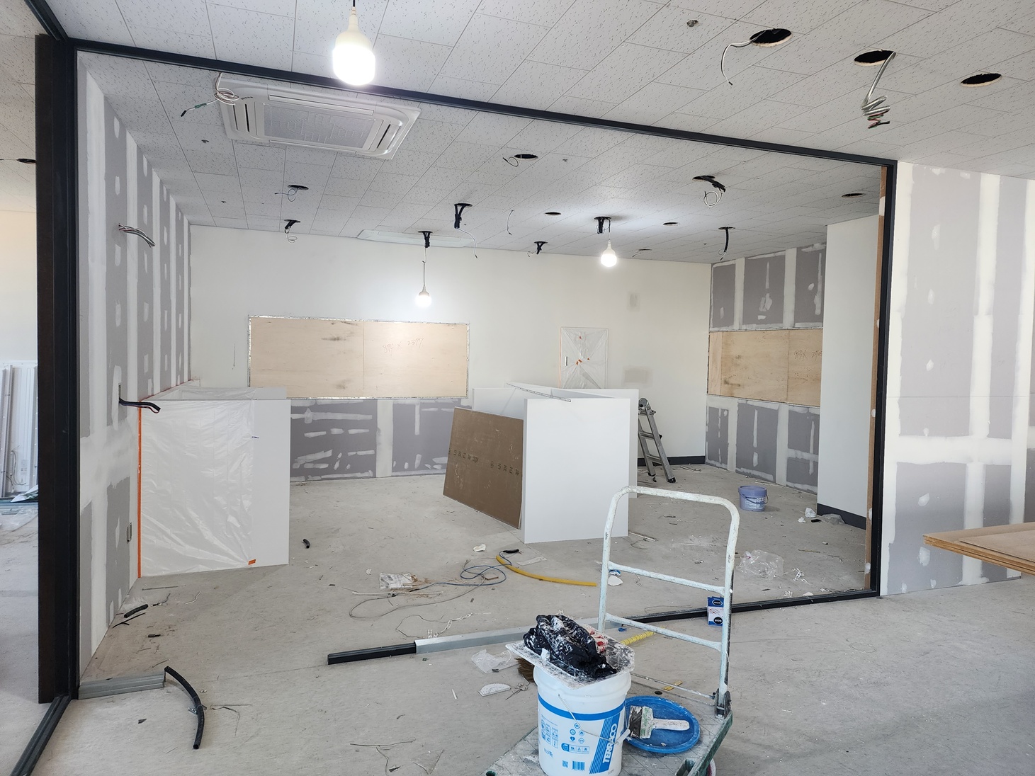 전기 공사는 전체적인 완성도를 좌우하는 과정으로 입구 라인 조명과 간접조명, 사무실 내 포인트 조명 등 모든 공간의 감성을 고려해 배선과 설치를 진행하였고, 마무리작업까지 완벽하게 점거하여 공사를 마쳤습니다.