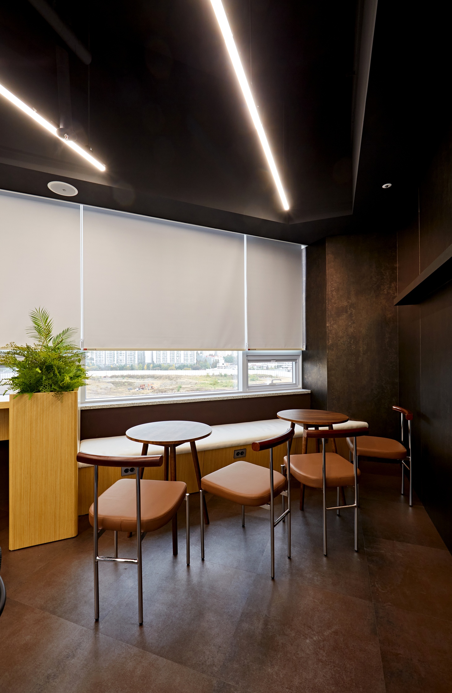 전체적으로 따뜻한 우드 톤을 사용하고 펜던트 조명과 바 테이블, 프리미엄 의자 등을 조합하여 감성적인 카페에 온 듯한 분위기를 연출하였습니다. 세련된 웰 패널과 라인 조명이 부드러운 분위기를 형성하며, 곳곳에 배치된 식물과 악세사리는 생동감을 더해줍니다.