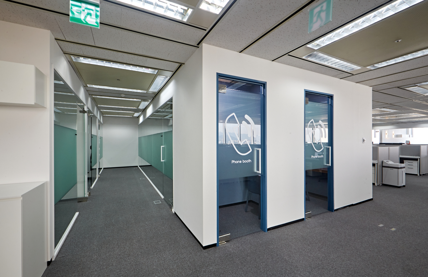 요즘 스타트업이나 새로 생겨나는 사무실 인테리어에서 종종 볼 수 있는 폰부스는, 중요한 전화나 사적인 내용을 다른 사람들에게 피해가 가지 않으면서 프라이빗하게 이야기할 수 있도록 마련된 공간입니다. 그렇기에 불투명 필름을 부착하였고, 화이트 시트지로 해당 공간의 용도를 명확하게 알렸습니다.