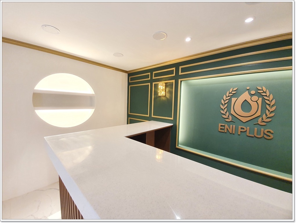 이 공간에 들어올 때 가장 정면에 위치하고 있어 돋보이는 곳입니다. 회사 로고와 이름을 가운데 배치하여 넣어 드렸으며 테두리 부분에 간접조명을 더하여 화사함을 강조하였습니다. 거기에 고급스러운 디자인의 벽 등까지 넣어 매력을 높였습니다.