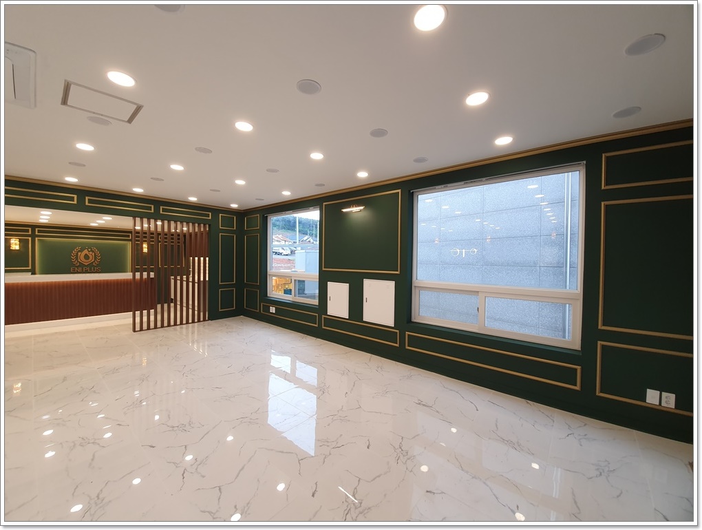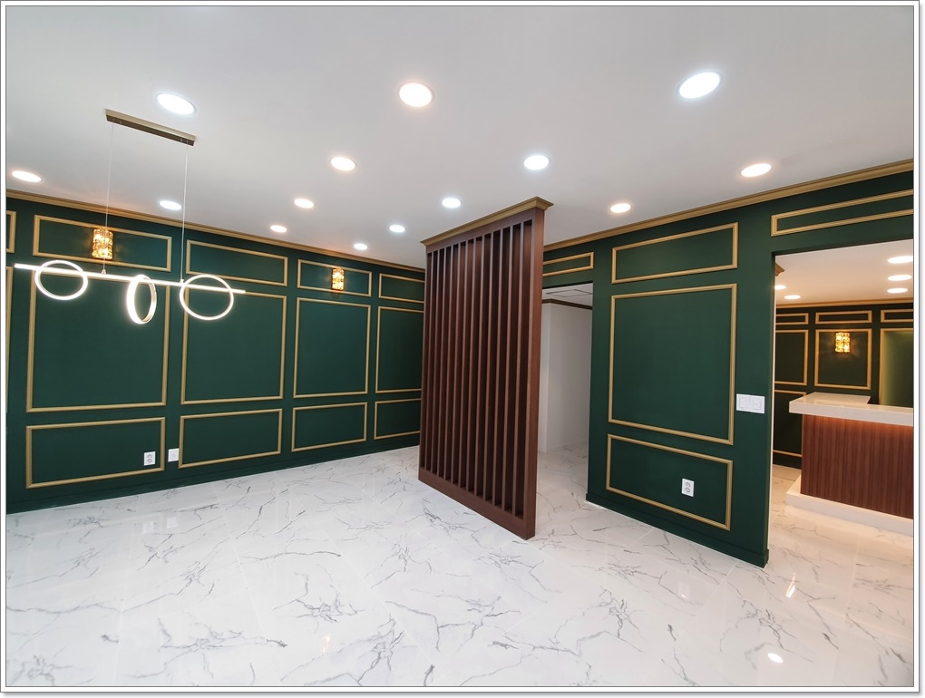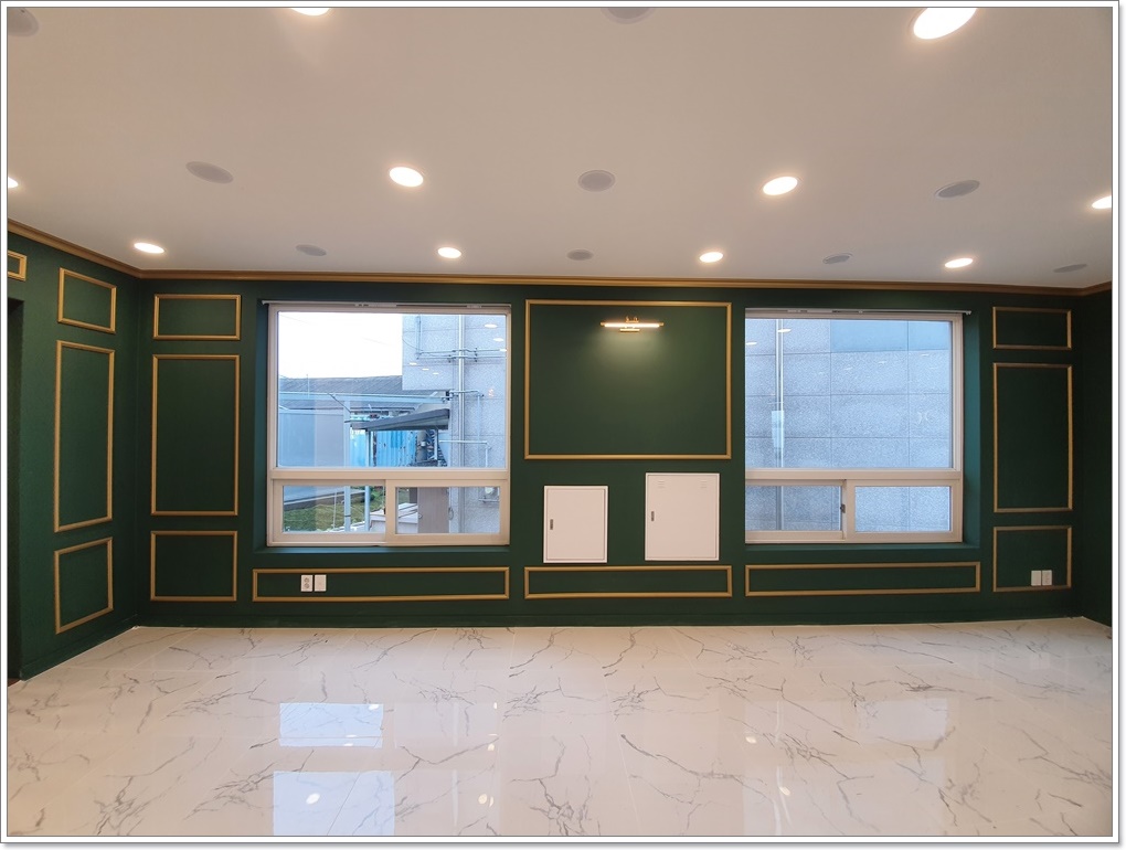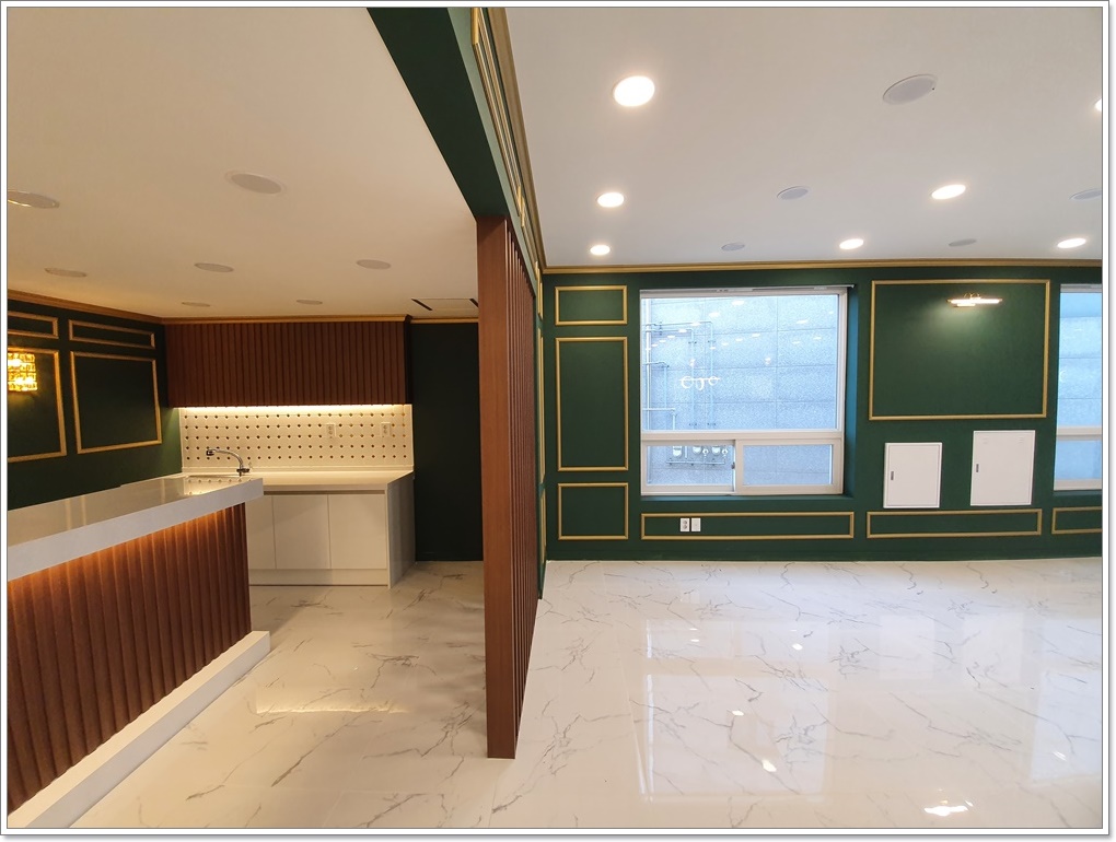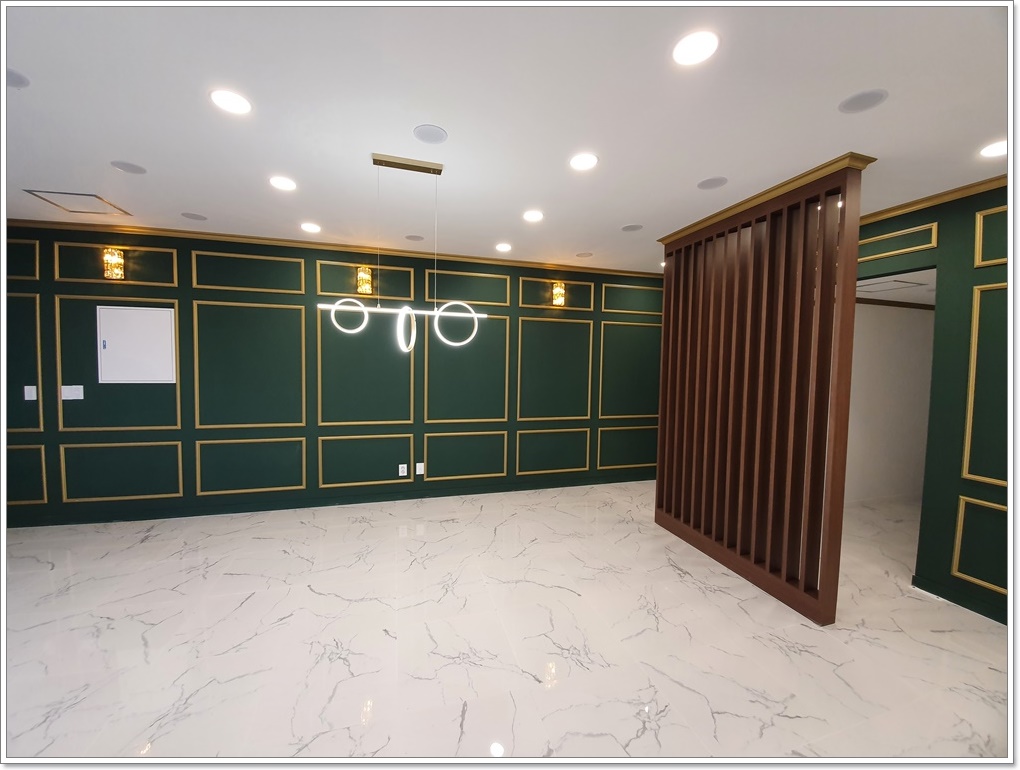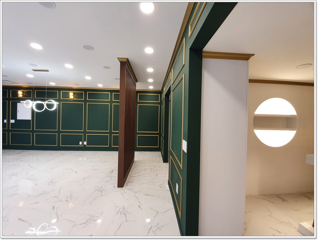 여의도 운정 고천 고급스러운 사무실인테리어 리모델링 시공사례 완성된 모습입니다. 바닥은 마블 패턴의 화이트 타일을 넣어 드려 고급스러움을 강조해 주었으며 천장에는 간접조명으로만 채워 화사함을 높여 드렸습니다. 거기에 벽면에는 그린 컬러의 웨인스코팅에 골드 프레임을 더하여 럭셔리한 부분까지 보여주고 있습니다.
