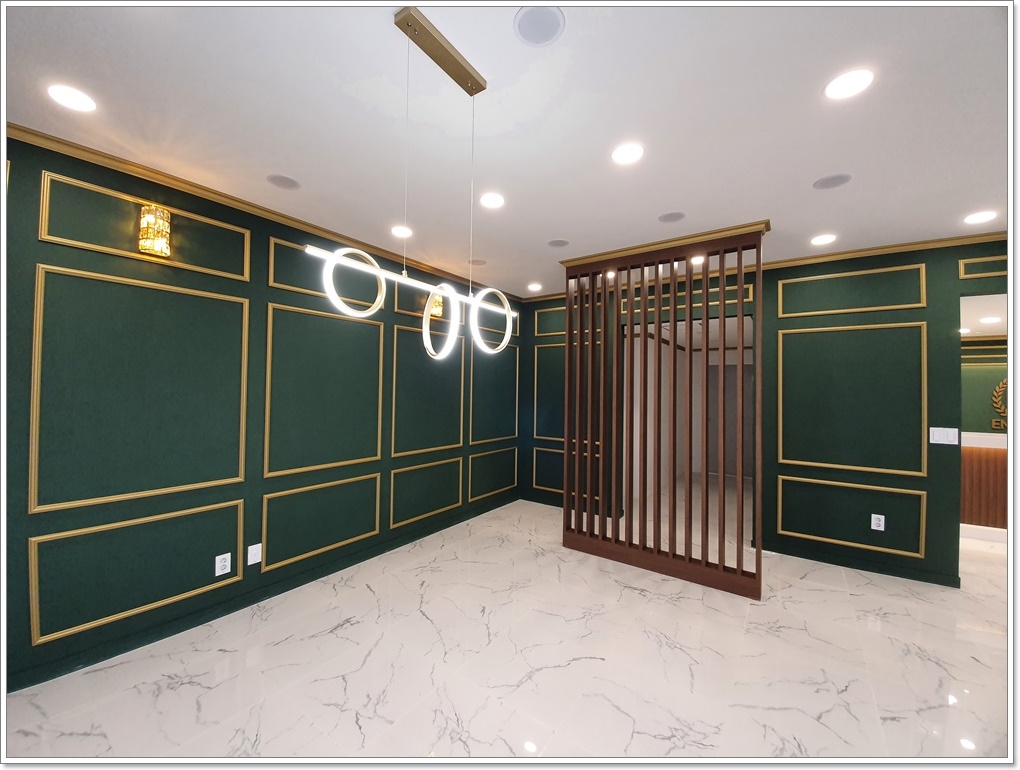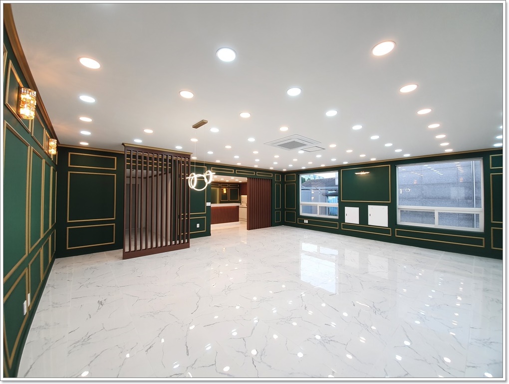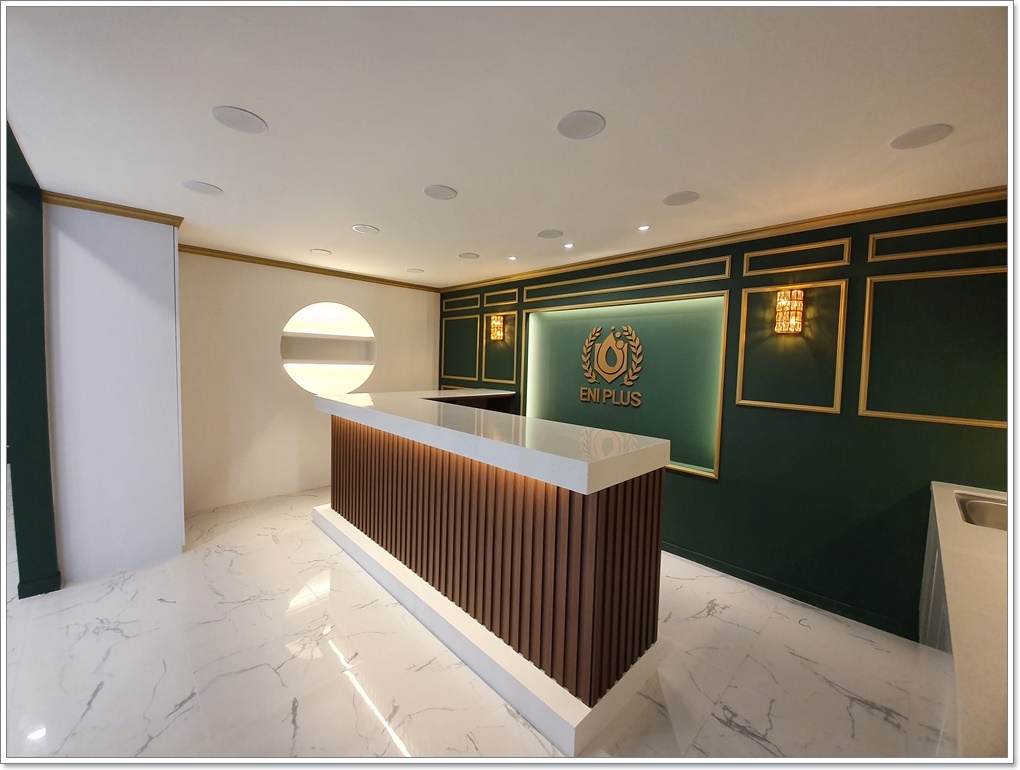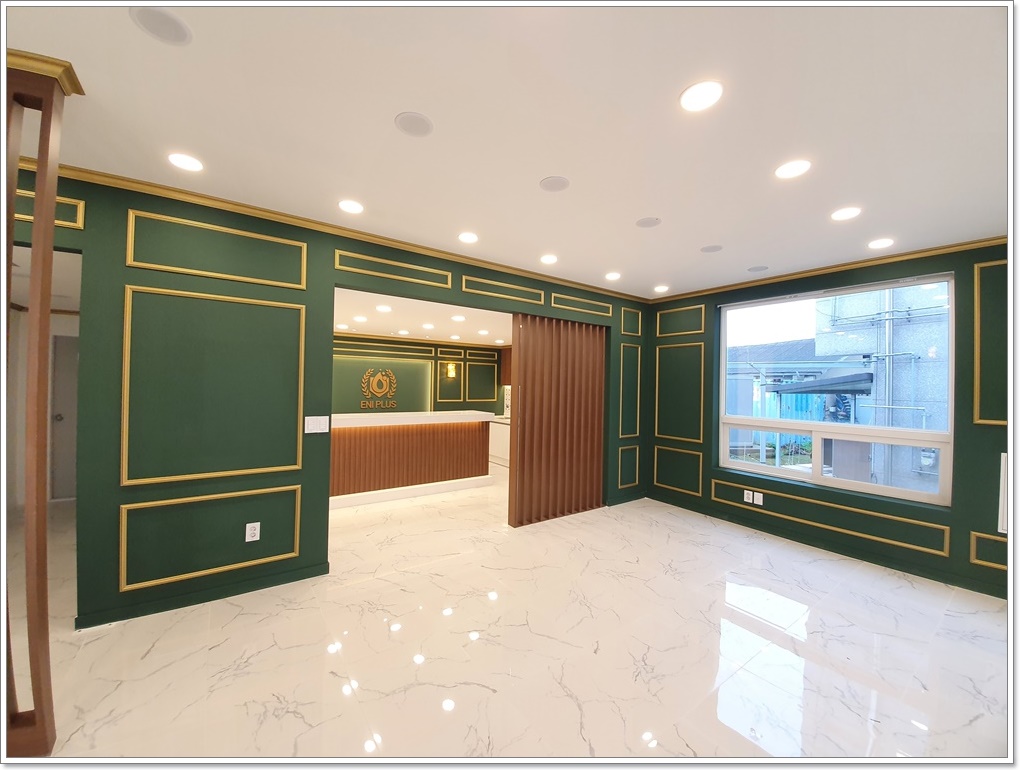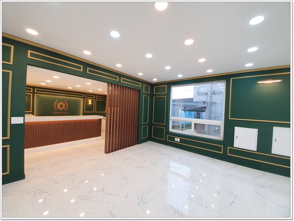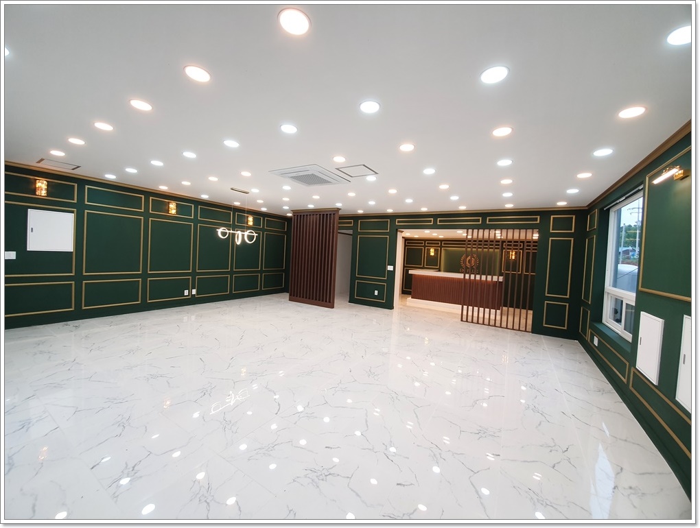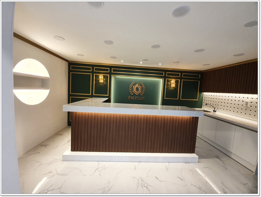 여의도 운정 고천 고급스러운 사무실인테리어 리모델링 시공사례 완성된 모습입니다. 바닥은 마블 패턴의 화이트 타일을 넣어 드려 고급스러움을 강조해 주었으며 천장에는 간접조명으로만 채워 화사함을 높여 드렸습니다. 거기에 벽면에는 그린 컬러의 웨인스코팅에 골드 프레임을 더하여 럭셔리한 부분까지 보여주고 있습니다.
