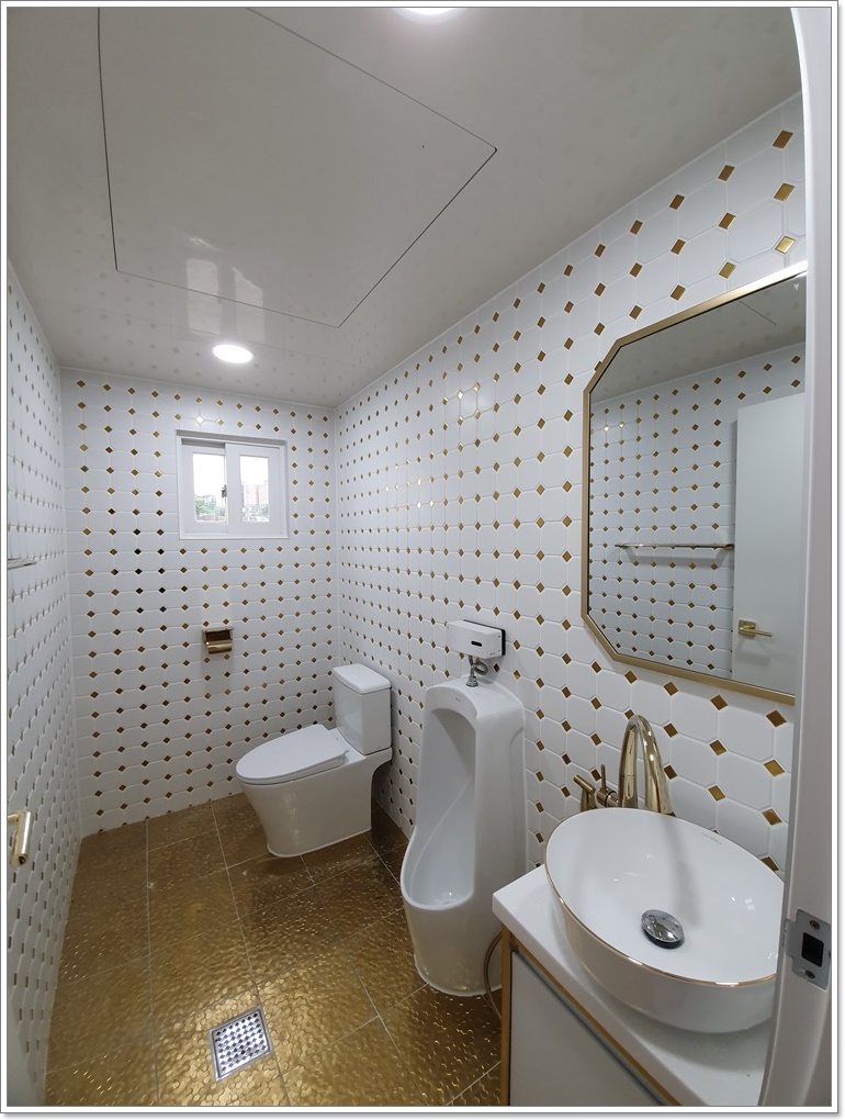 이번 현장의 화장실은 화이트와 골드 컬러로만 디자인하여 채워 드렸습니다. 바닥은 골드 컬러의 타일로 가득 채워 럭셔리한 분위기를 강조하였으며 벽면에는 앞서 싱크대 부분에서 보신 벽면과 같은 디자인으로 넣었습니다. 거기에 화장실 액세서리나 거울 프레임까지 골드 컬러를 더하여 고급스러움을 확실하게 연출하였습니다.