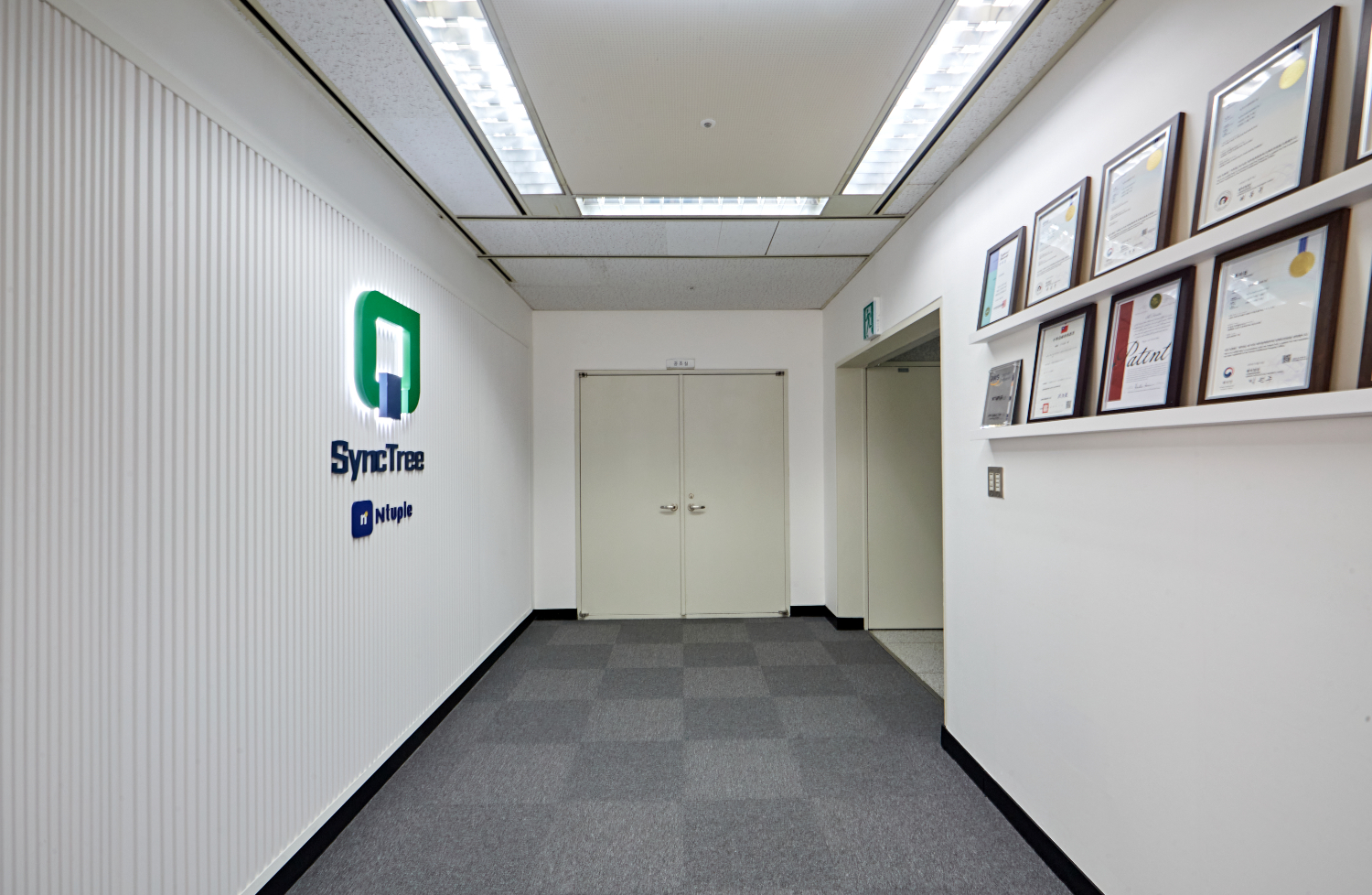 들어가는 입구 공간입니다. 화이트 템바보드로 전면을 채운 벽에는 해당 회사의 로고가 입체적으로 부착되어 있습니다. 또한 led 조명이 후면에 매립되어 보다 밝고 집중도를 높여줍니다.